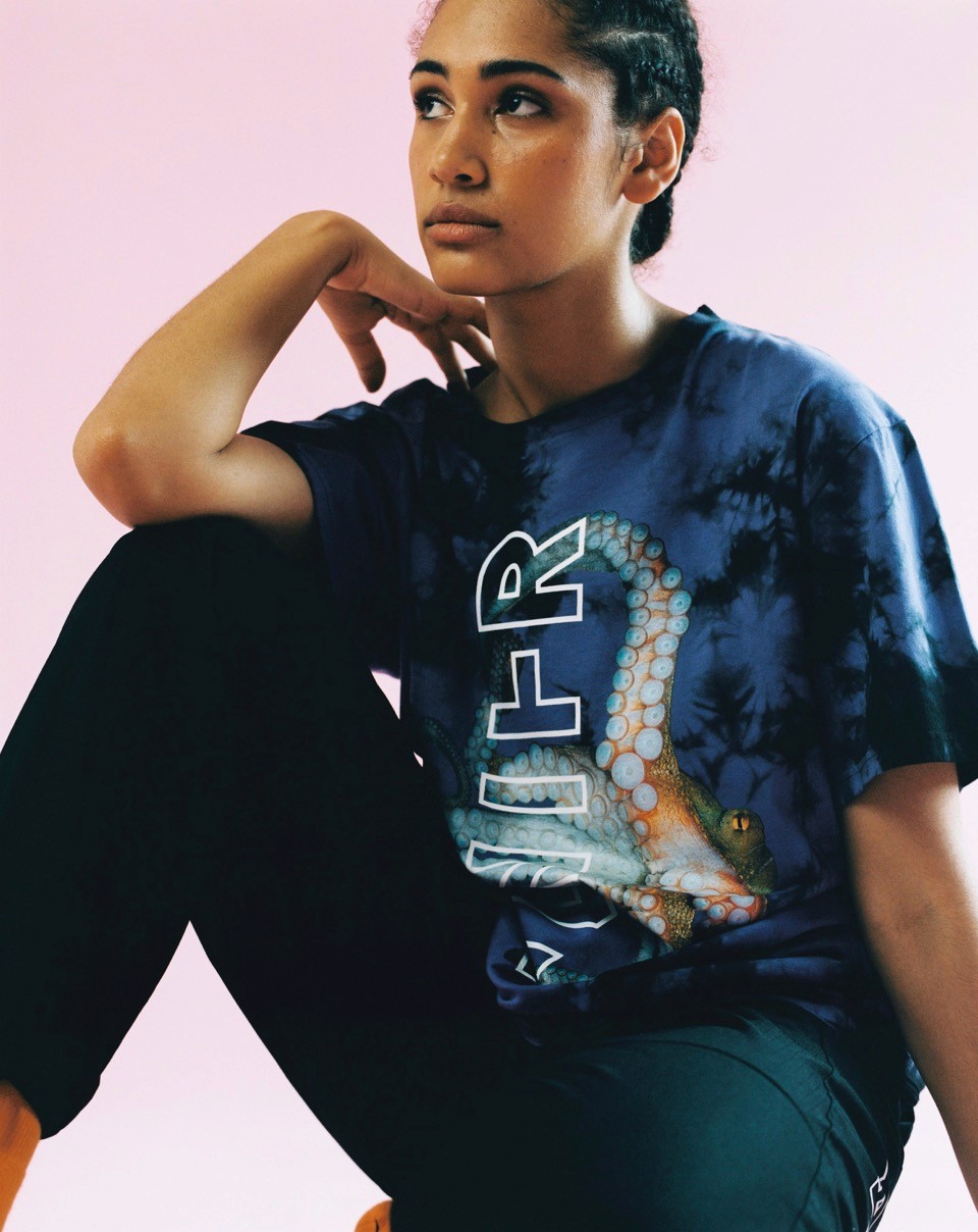Bercée par l’essor du skate, du roller et du BMX, les années 90 offrent ce quelque chose d’insolent et de nostalgique qui nous titillent encore aujourd’hui. Des looks souvenirs qui rappellent la légèreté et le décontracté, prônant une forme de singularité et de non-conformisme. Pièce clef de la collection, le T-shirt imprimé d’un poulpe agressif en tye-dye, symbole d’une jeunesse désenchantée et activiste, résume l’esprit indépendant des 90s et son non-goût emblématique.
