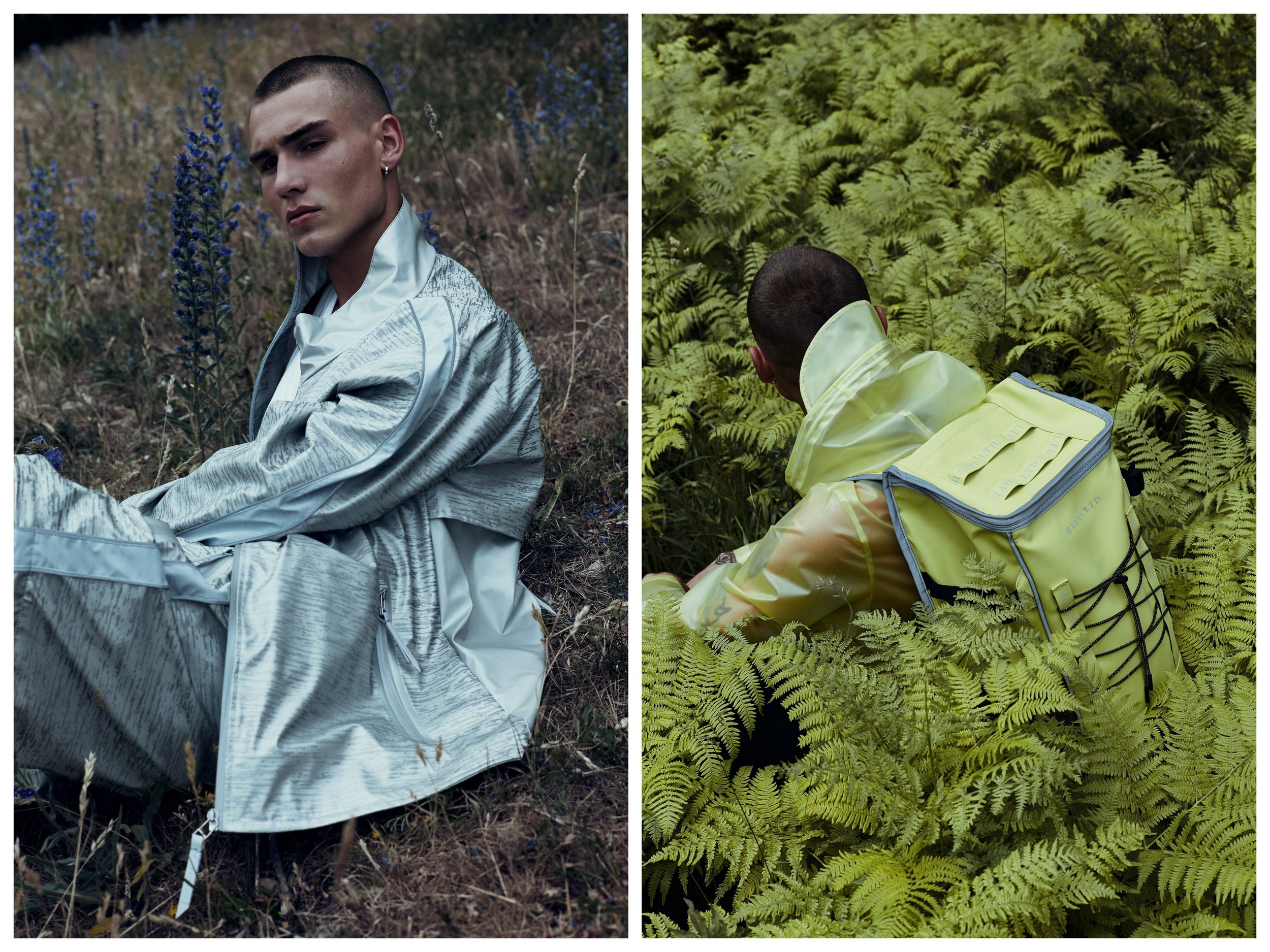 Néons étanches et argent réfléchissant sont les codes couleurs phares de la collection Rains SS19 Ltd.