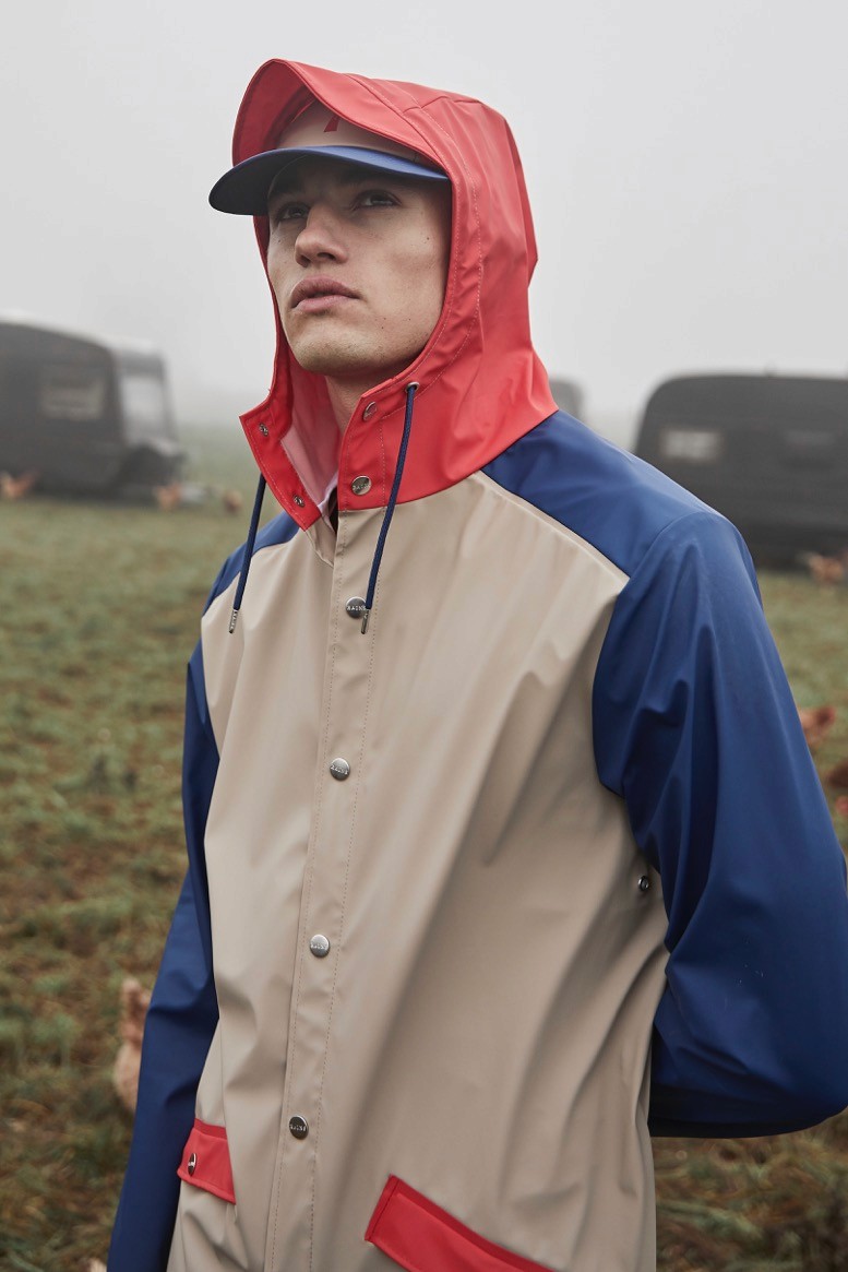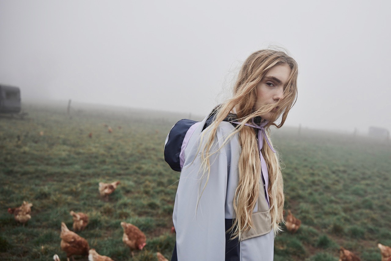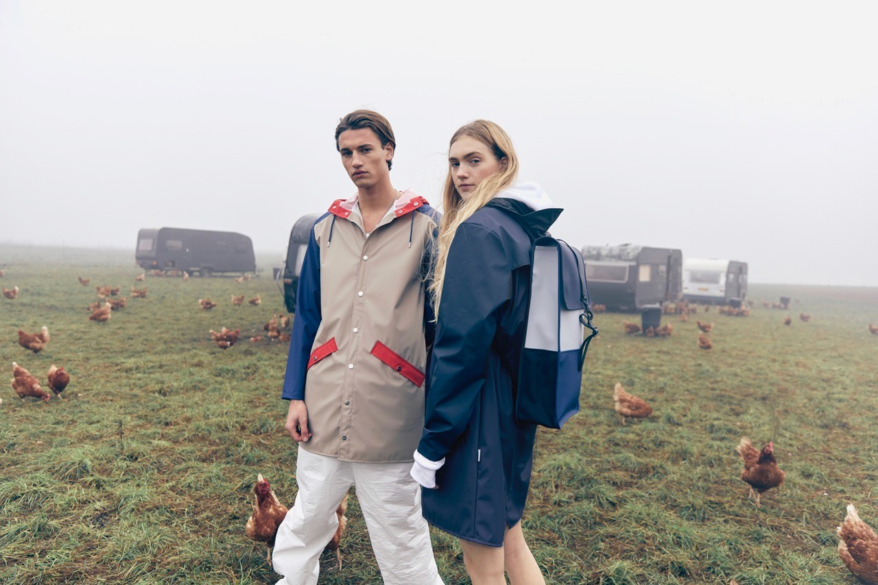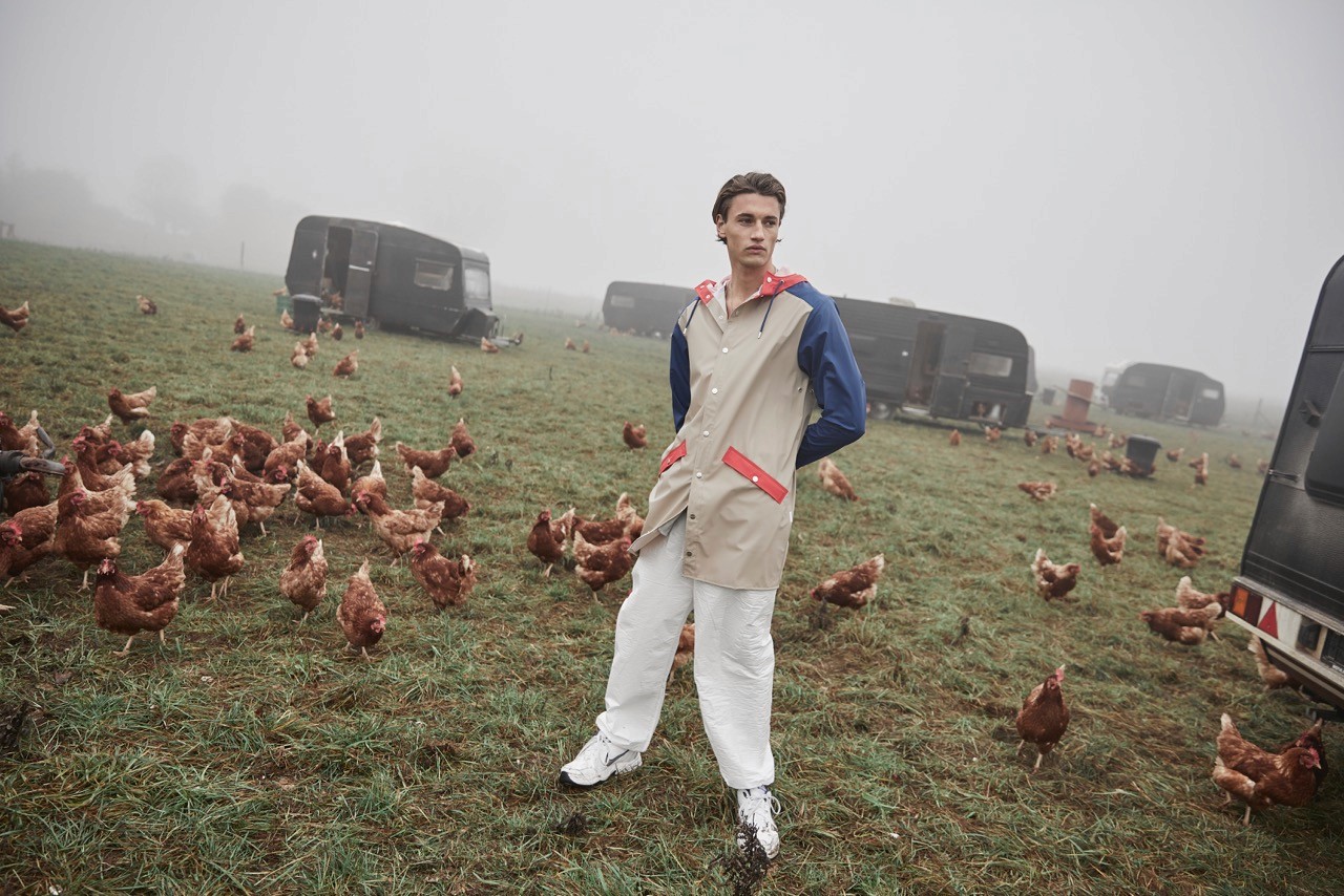 Contrastant avec son ambiance ultra-urbaine, la collection Color Block est présentée dans un élevage de poulets au milieu de caravanes en pleine nature dans une ferme biologique gérée par de jeunes agriculteurs qui se trouve à seulement cinq kilomètres du siège social de Rains, à Topkaergard au Danemark.