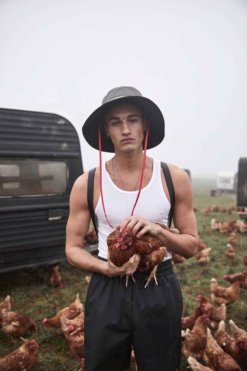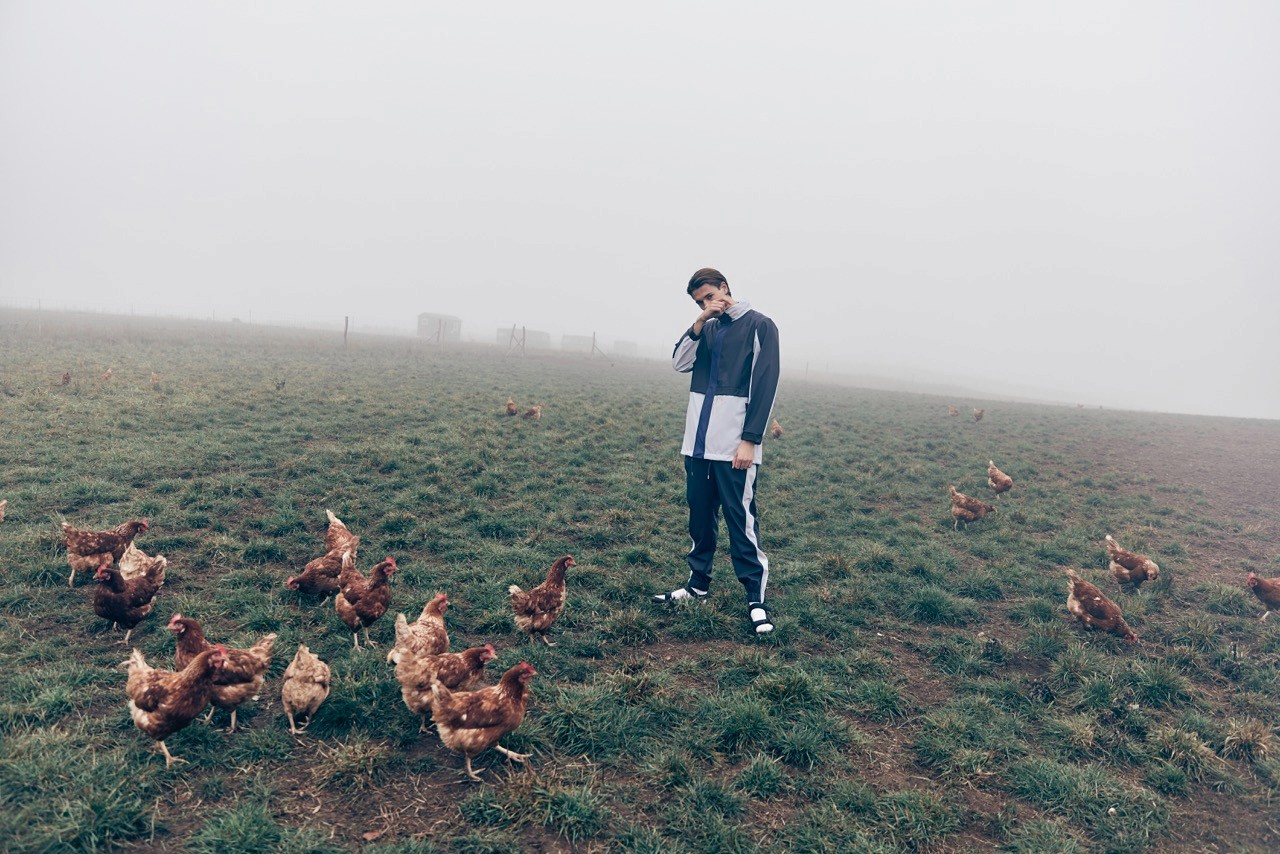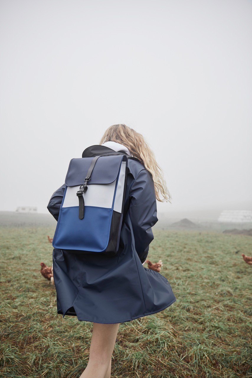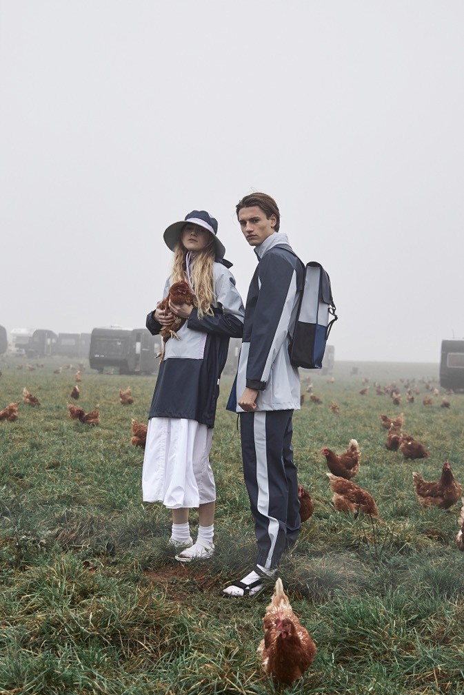 Contrastant avec son ambiance ultra-urbaine, la collection Color Block est présentée dans un élevage de poulets au milieu de caravanes en pleine nature dans une ferme biologique gérée par de jeunes agriculteurs qui se trouve à seulement cinq kilomètres du siège social de Rains, à Topkaergard au Danemark.