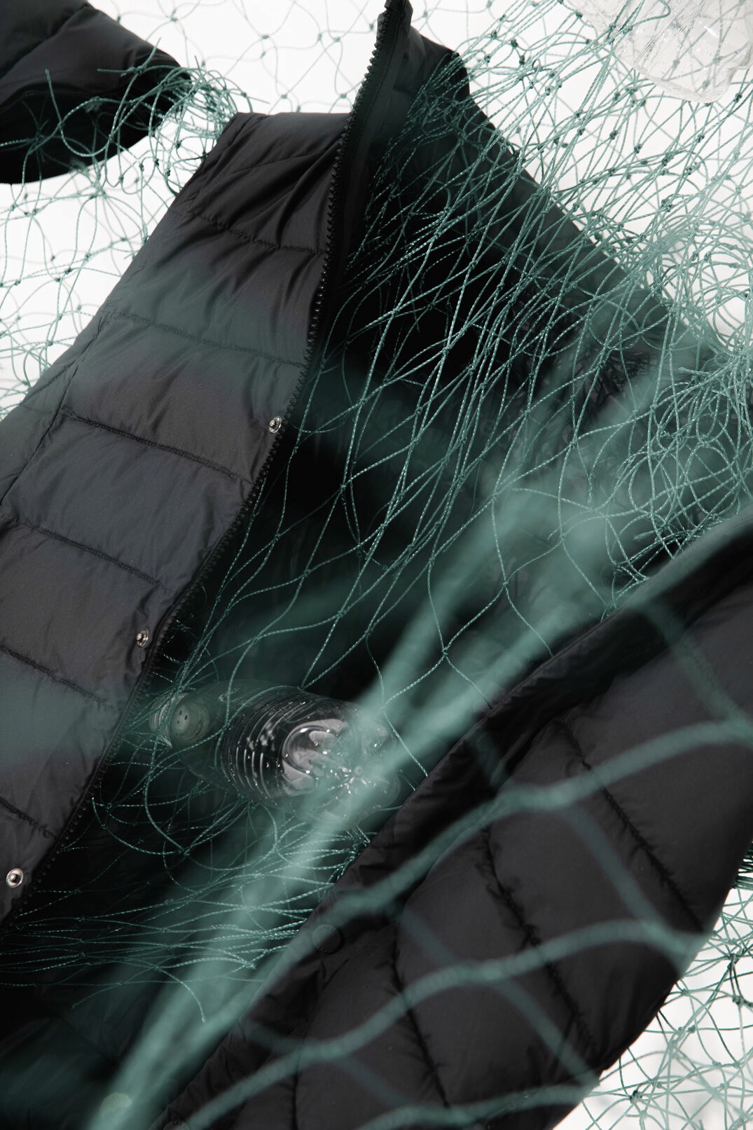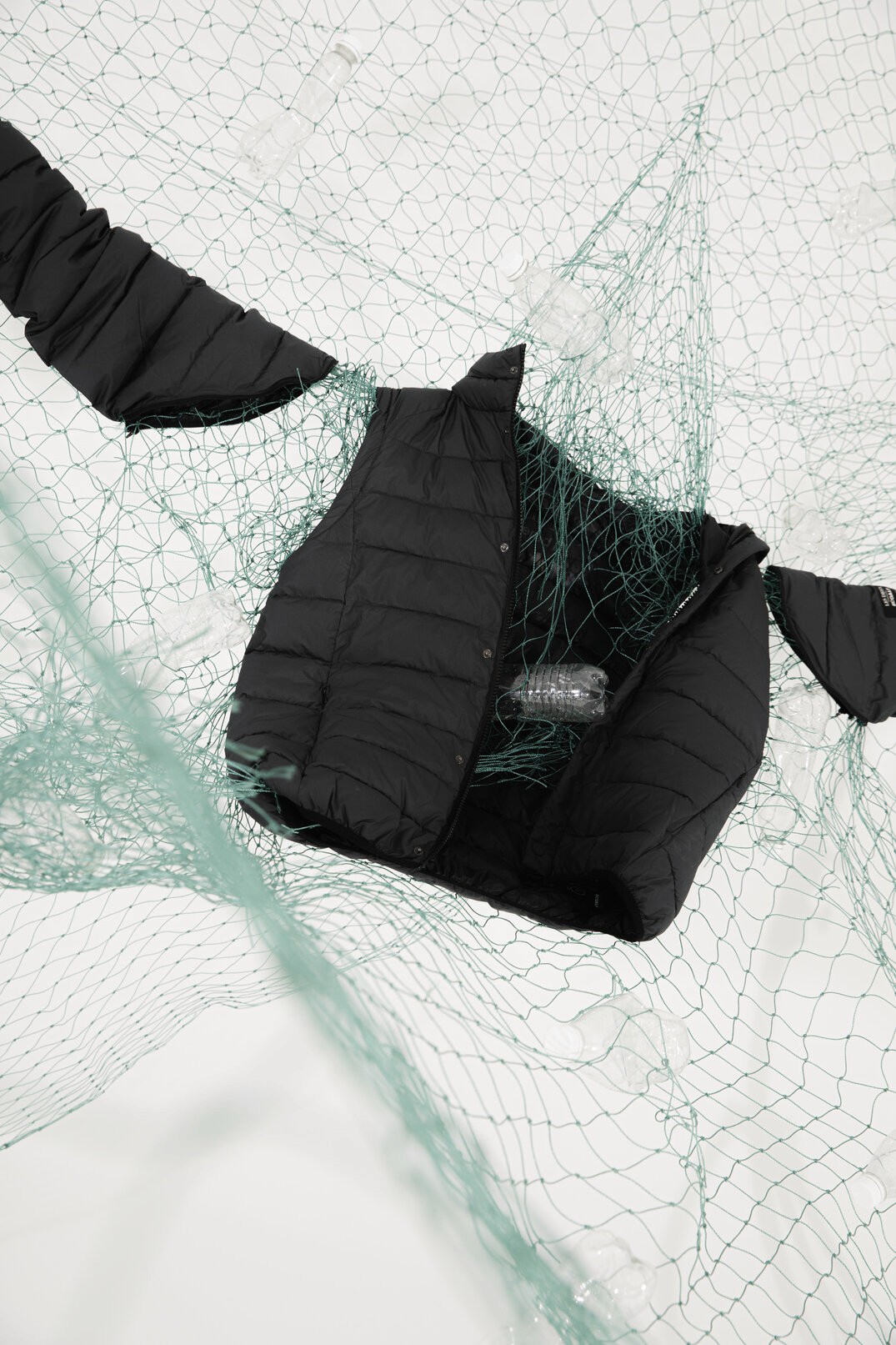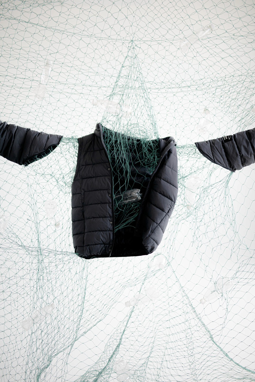 La veste est réalisée à partir de bouteilles en plastique PET recueillies dans l’océan. Chaque mètre de tissu représente 70 bouteilles recyclées et une veste est composée d’environ 120 bouteilles qui, ainsi, ne finissent plus dans les océans.
