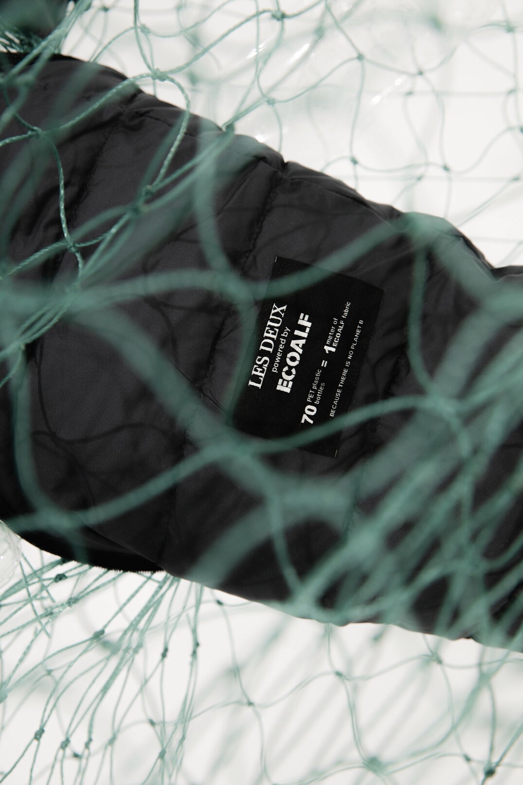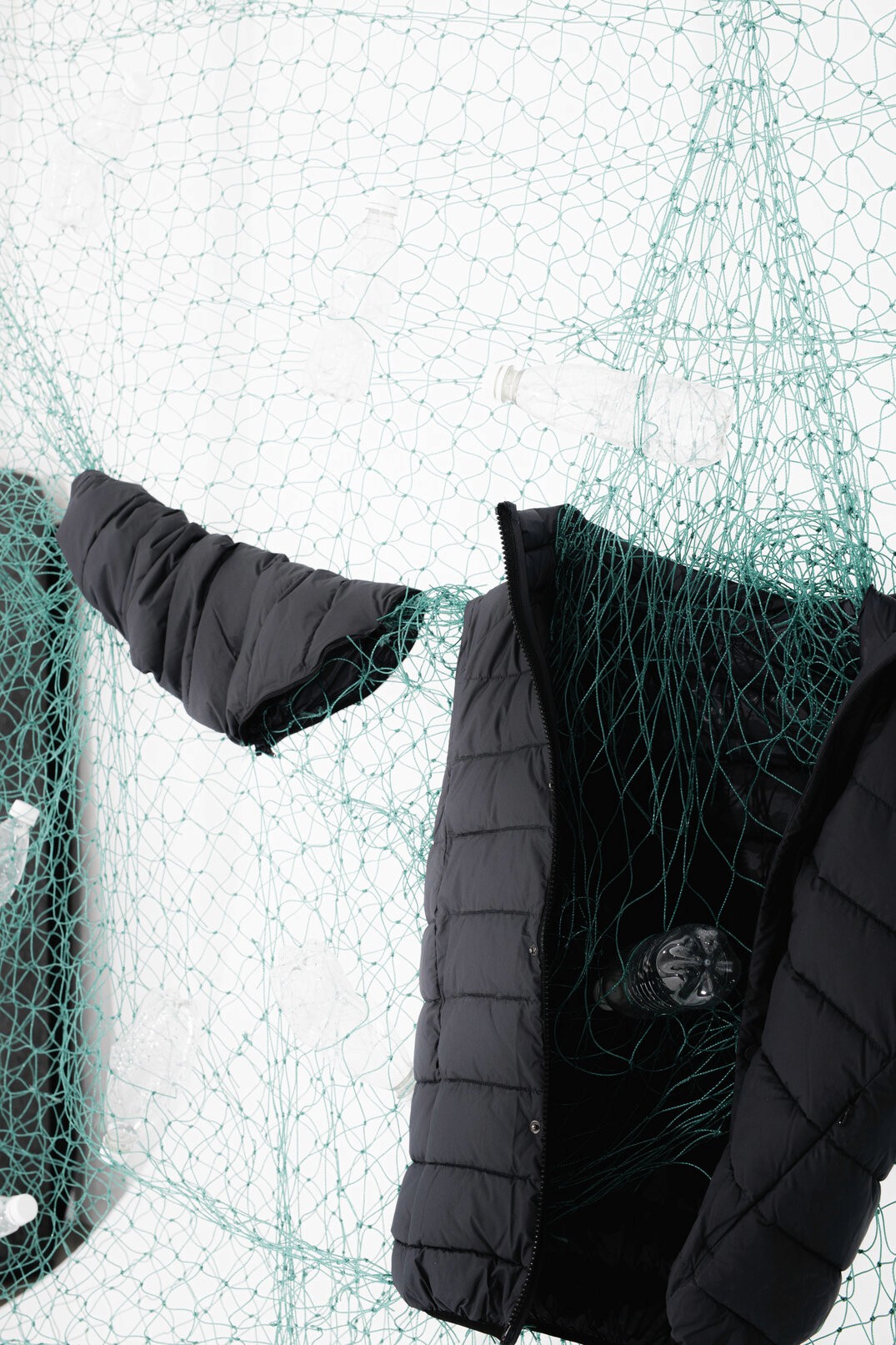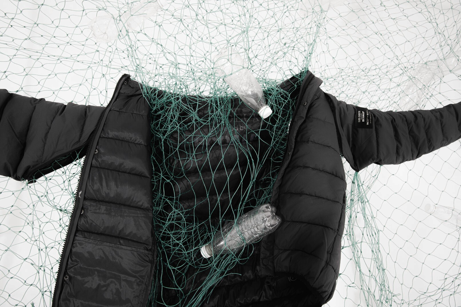 La veste est réalisée à partir de bouteilles en plastique PET recueillies dans l’océan. Chaque mètre de tissu représente 70 bouteilles recyclées et une veste est composée d’environ 120 bouteilles qui, ainsi, ne finissent plus dans les océans.