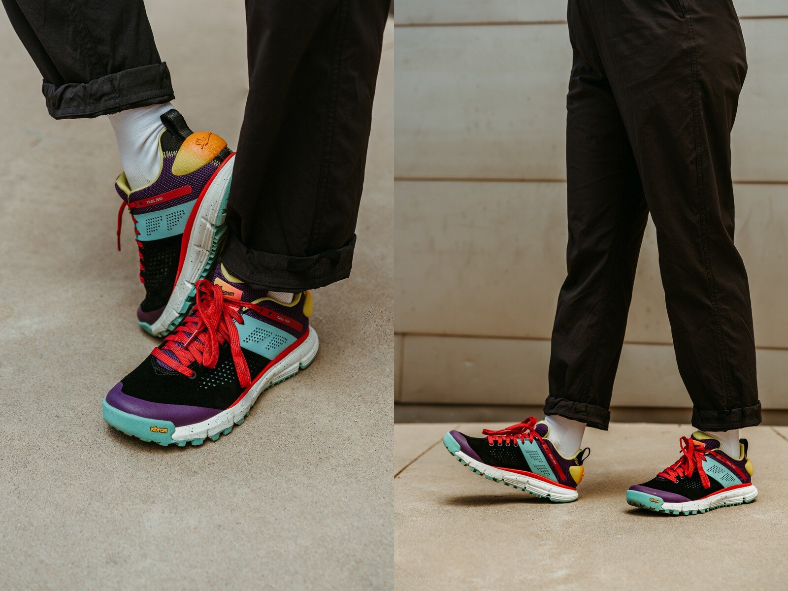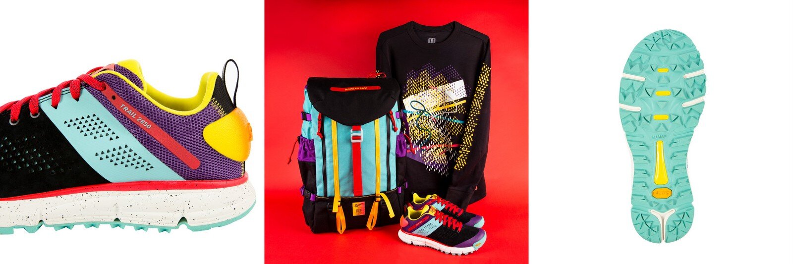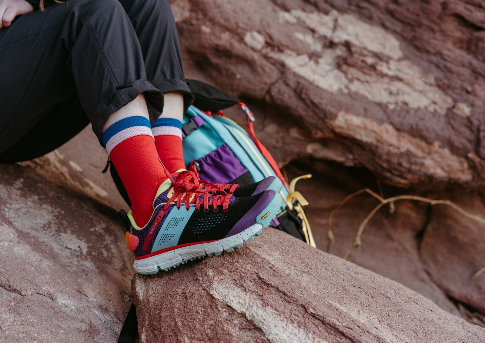 Topo Designs x Danner Trail 2650 . La Trail 2650 est une chaussure emblématique de la gamme Danner, inspirée par la diversité du terrain le long du 2650 miles Pacific Crest Trail. C’est un modèle incroyablement léger et respirant pour le printemps et l'été. Elle est composée d’une tige légère et durable en daim et en textile avec une semelle Vibram® avec Megagrip. Ses couleurs vives sont un clin d'œil aux années 90 et à la signature stylistique de Topo Designs.