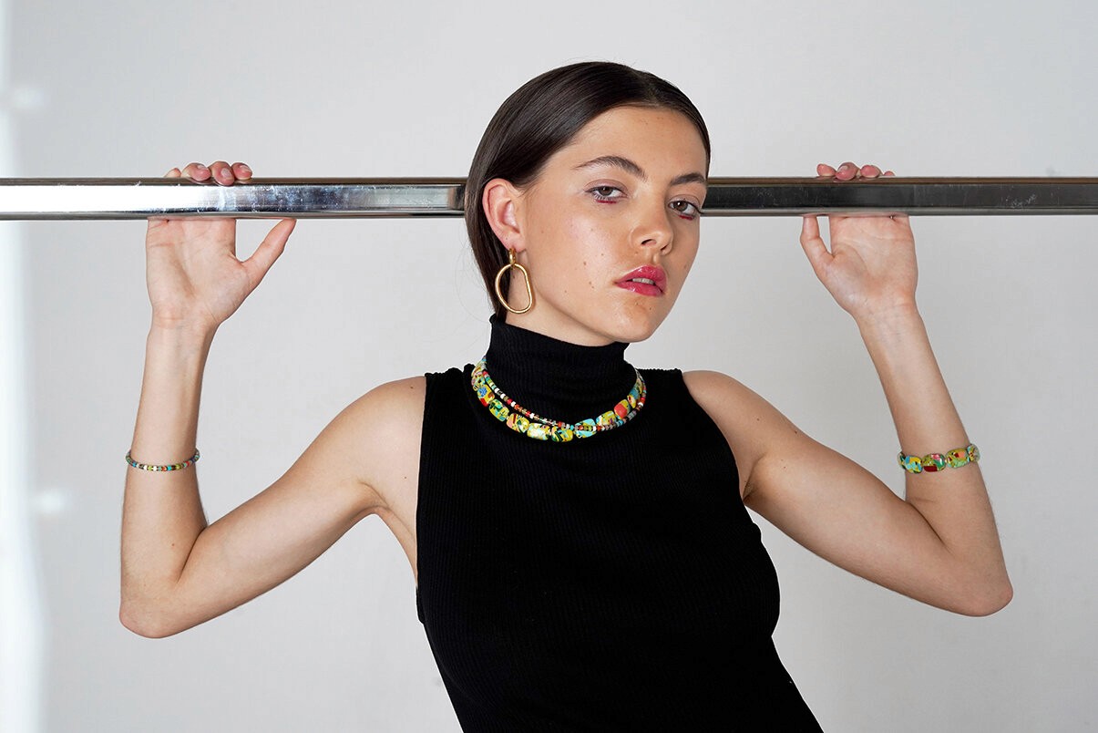 Ces perles chères au cœur de la créatrice sont leur ADN en l'Afrique et ont fini par devenir le sien. Elle a rencontré sa fournisseuse à Accra au Ghana où sont sourcées les perles en vinyle recyclé qui sont, là aussi, un savoir-faire artisanal authentique.