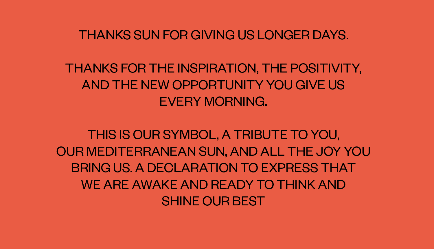 Ceci est notre symbole. Un hommage à toi. Un soleil méditerranéen et toute la joie que tu nous apportes. Une déclaration pour exprimer que nous sommes réveillés et prêts à penser et à briller de notre mieux.