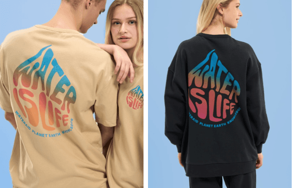 Cette capsule comprend trois tee-shirts à manches courtes, un tee-shirt à manches longues, un sweat à capuche, deux autres sweats sans capuche, un jogging, le tout décliné dans les coloris beige et noir. En ce qui concerne les accessoires, un tote-bag et une gourde sont proposés. Tous ces produits comportent l’inscription “Water Is Life”, qui est le slogan du projet de la marque KnowledgeCotton Apparel et de l’organisation Water Aid.