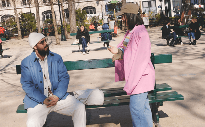 Le shooting s’est déroulé à Paris en Mars dernier. Léa et Nicolas ont porté des pièces choisies dans la collection SS22 de la marque danoise. Léa a sélectionné le blazer Arky en rose et le jean Kimai. Nicolas, connu pour son humour décalé, a choisi lui une superposition de chemises, style qu’il manie à la perfection.