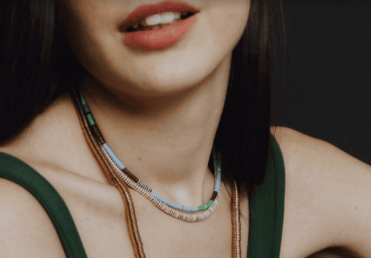 Aurélia utilise également les perles en vinyle recyclé du Ghana qu’elle travaille depuis ses débuts. Ces perles, aujourd’hui parties prenantes de l’ADN Maison Monik, sont directement sourcées par la créatrice qui se rend régulièrement en Afrique.