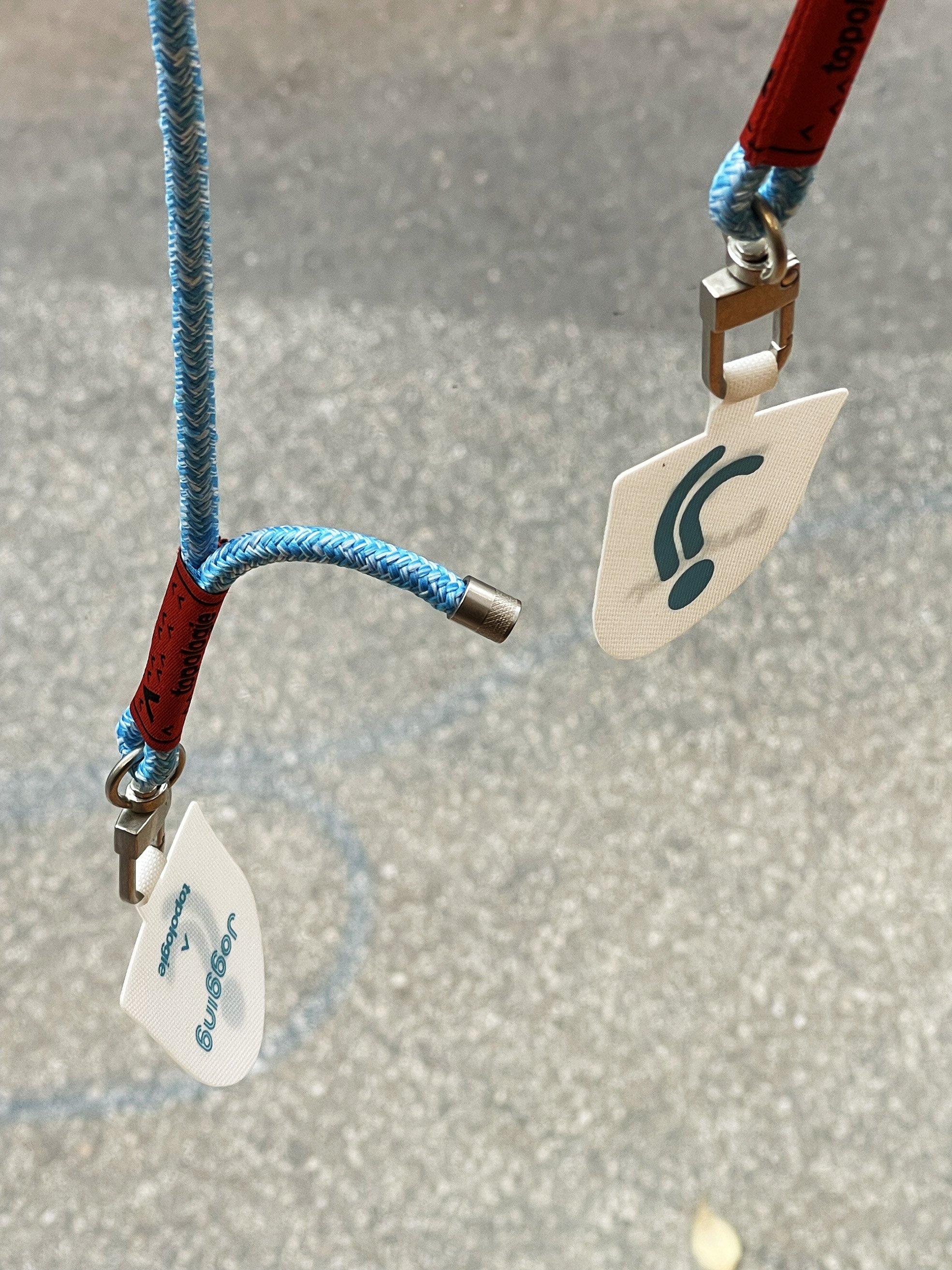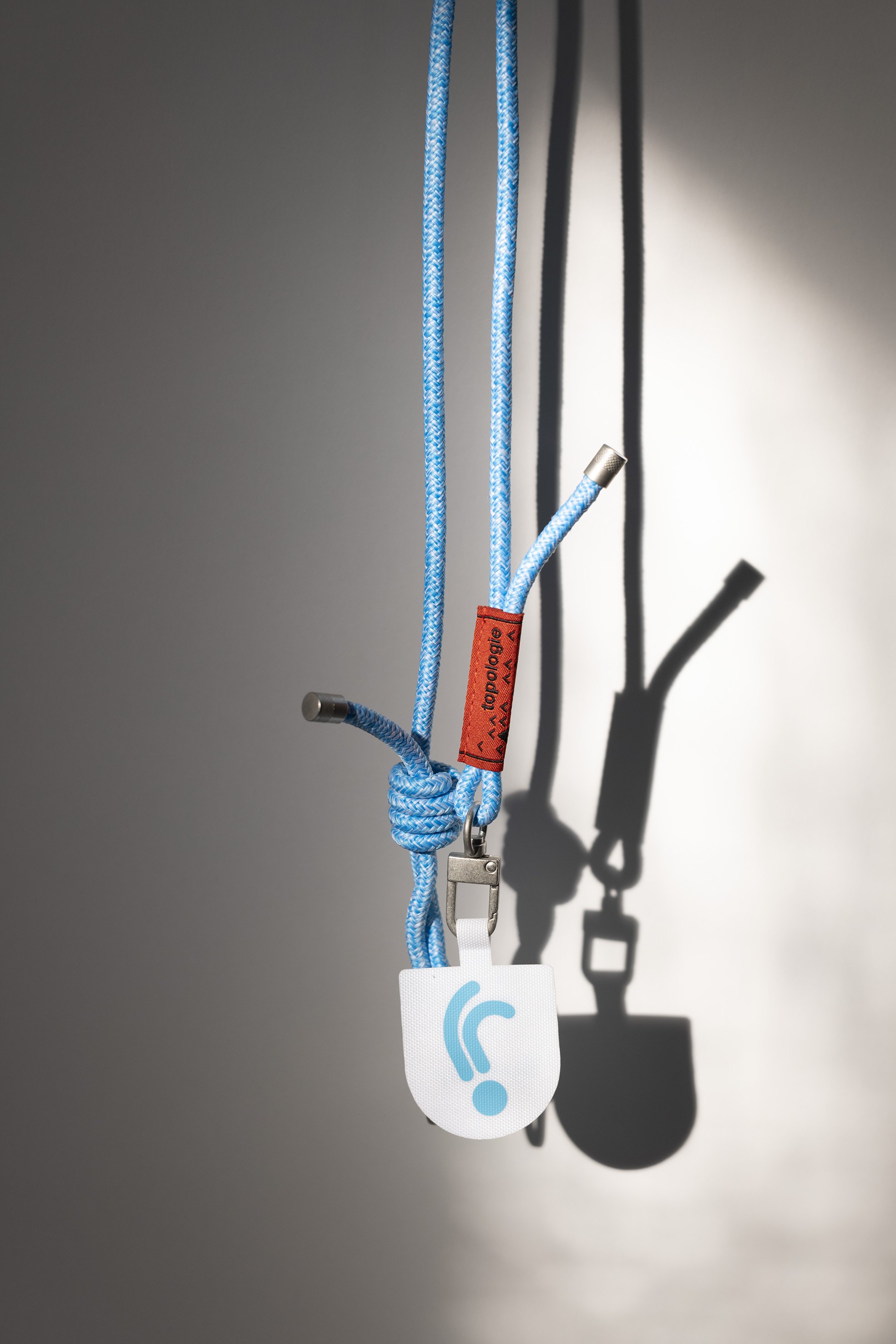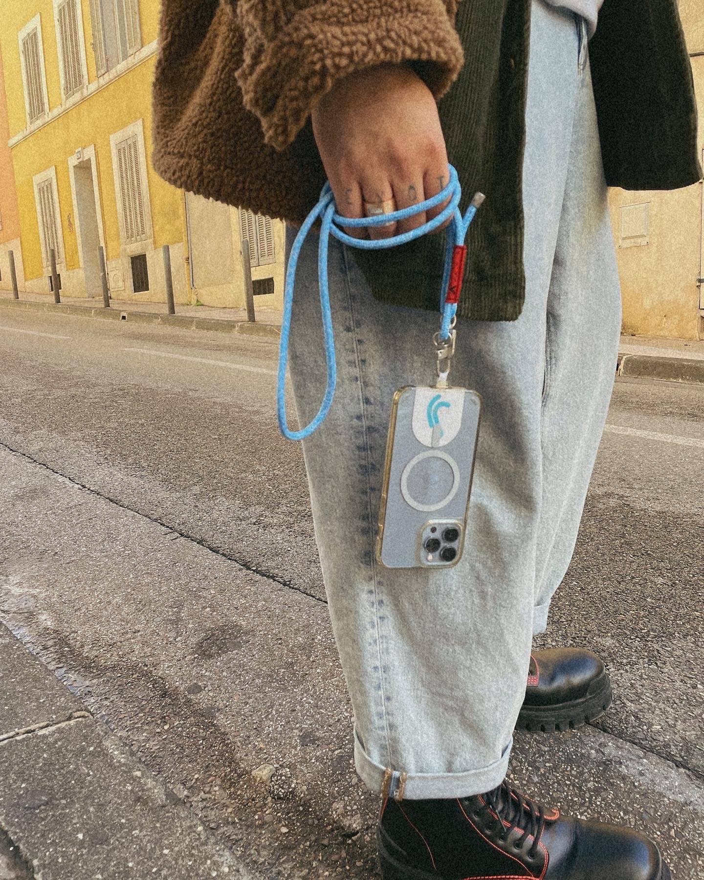 Le cordon de 6.0mm, best seller chez Topologie, reprend le bleu Jogging. Le “phone strap adapter”, petite languette en nylon laminé ultra-résistant, permet d’attacher le cordon au téléphone en le glissant sous la coque.