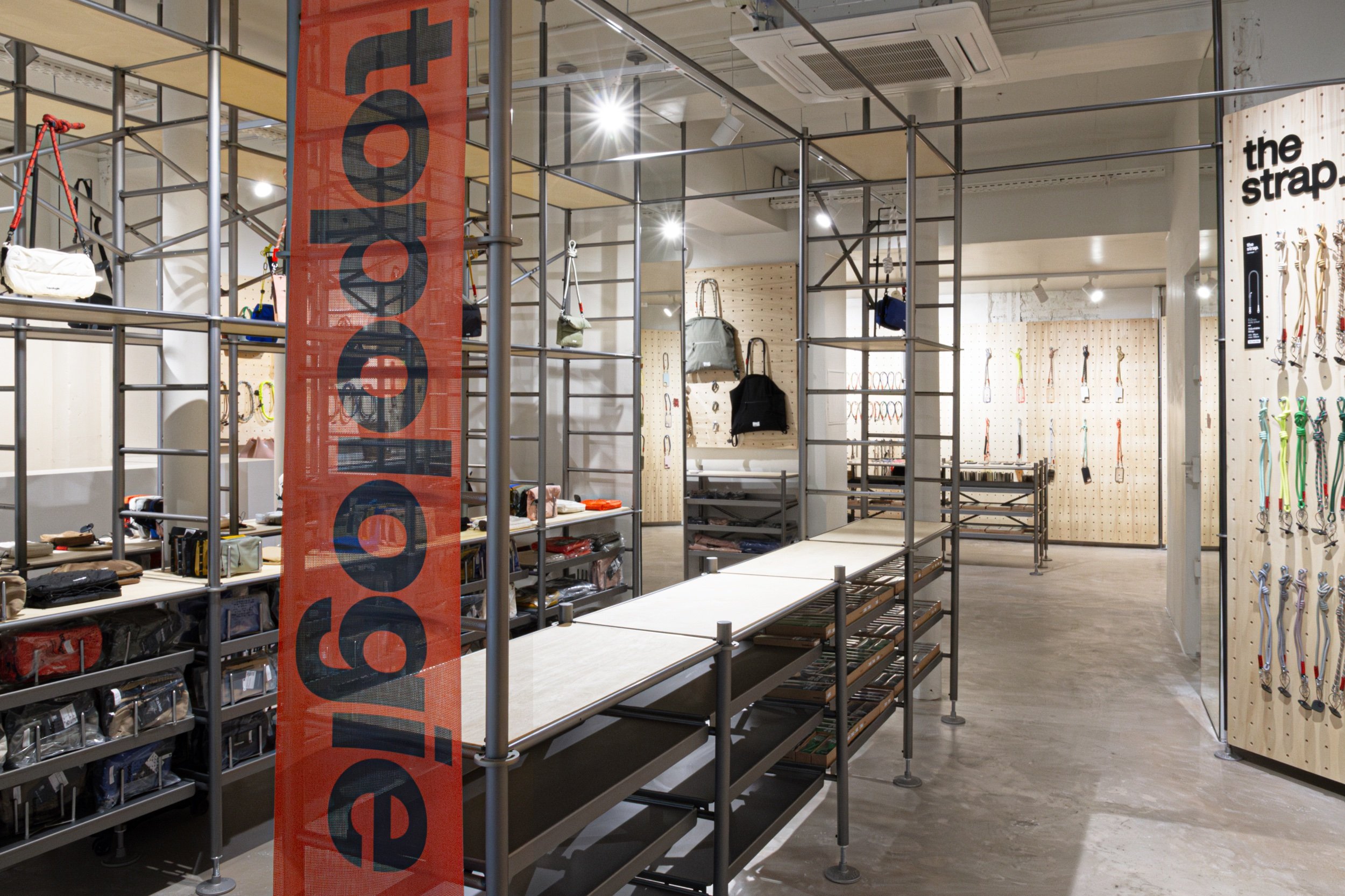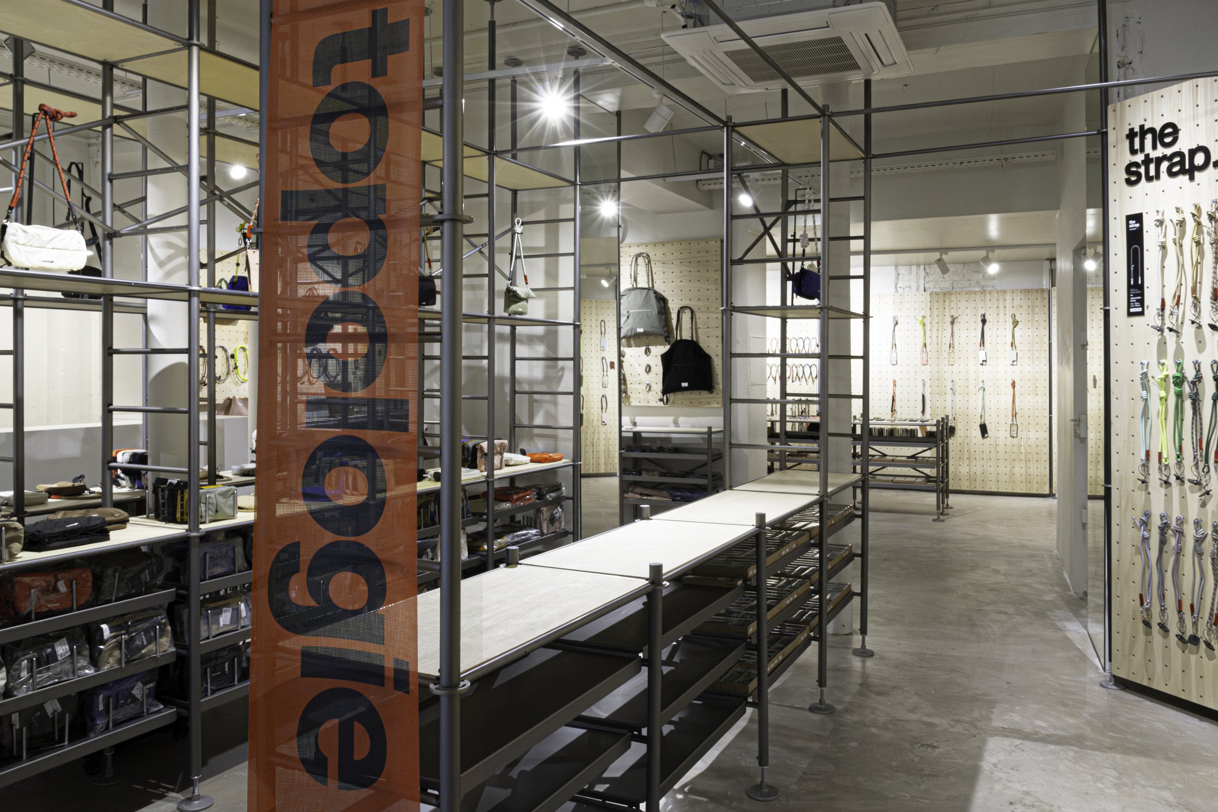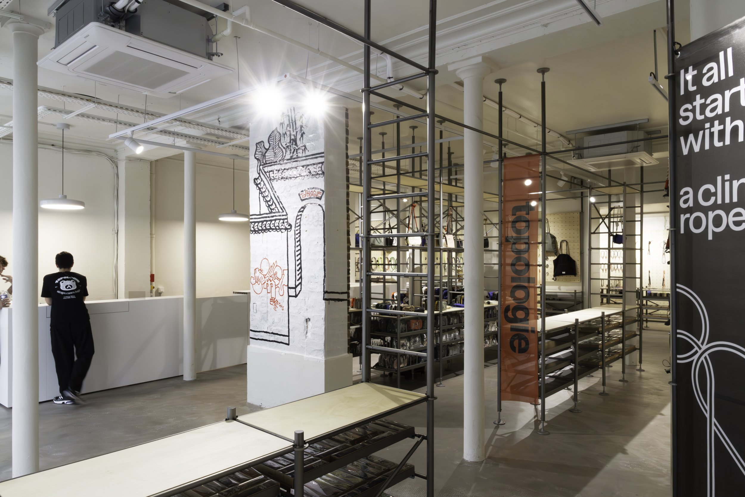 Le magasin a été conçu en collaboration avec le bureau de design japonais Keiji Takeuchi, basé à Milan, qui a traduit le souhait de Topologie, influencée par le matériel d'escalade, d’adopter une esthétique fonctionnelle en se revêtant d’un intérieur et d’un display inspirés des échafaudages.