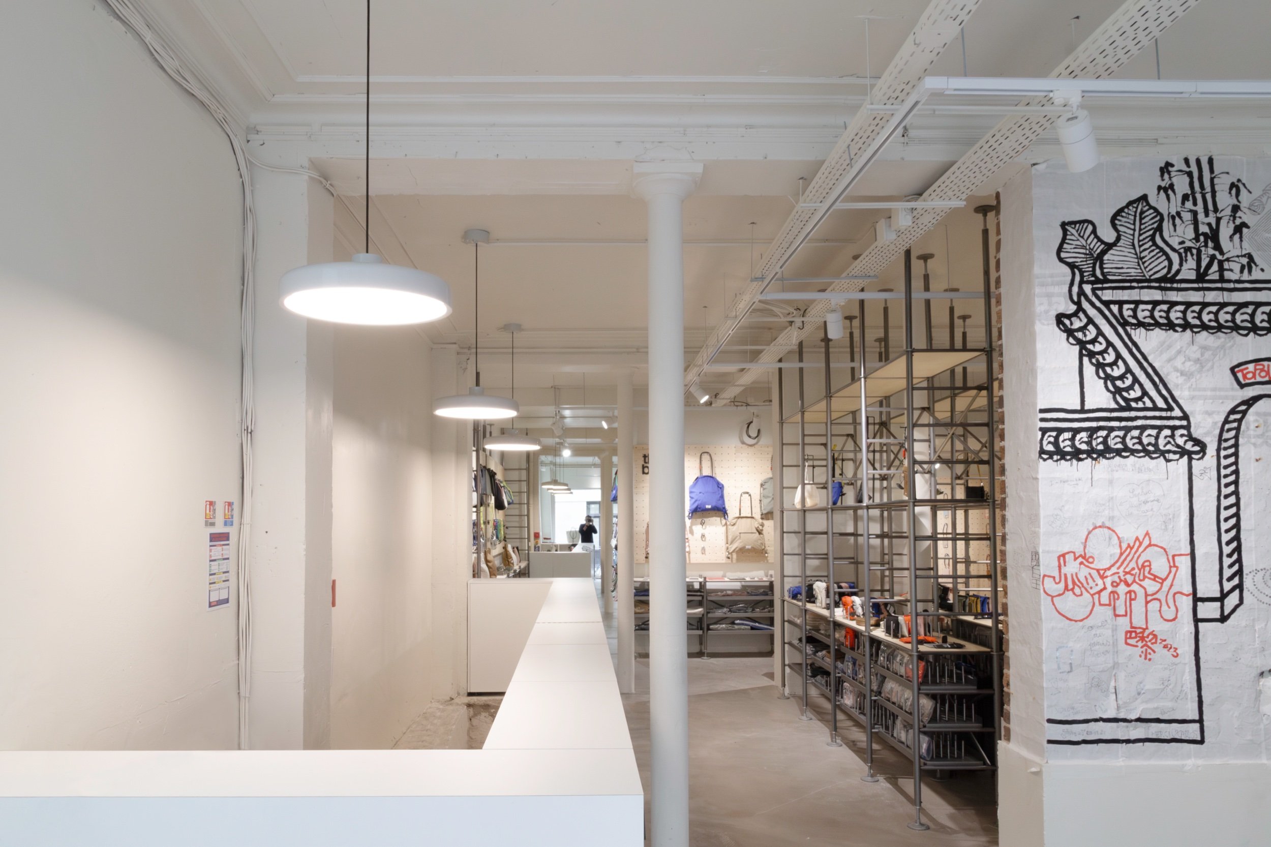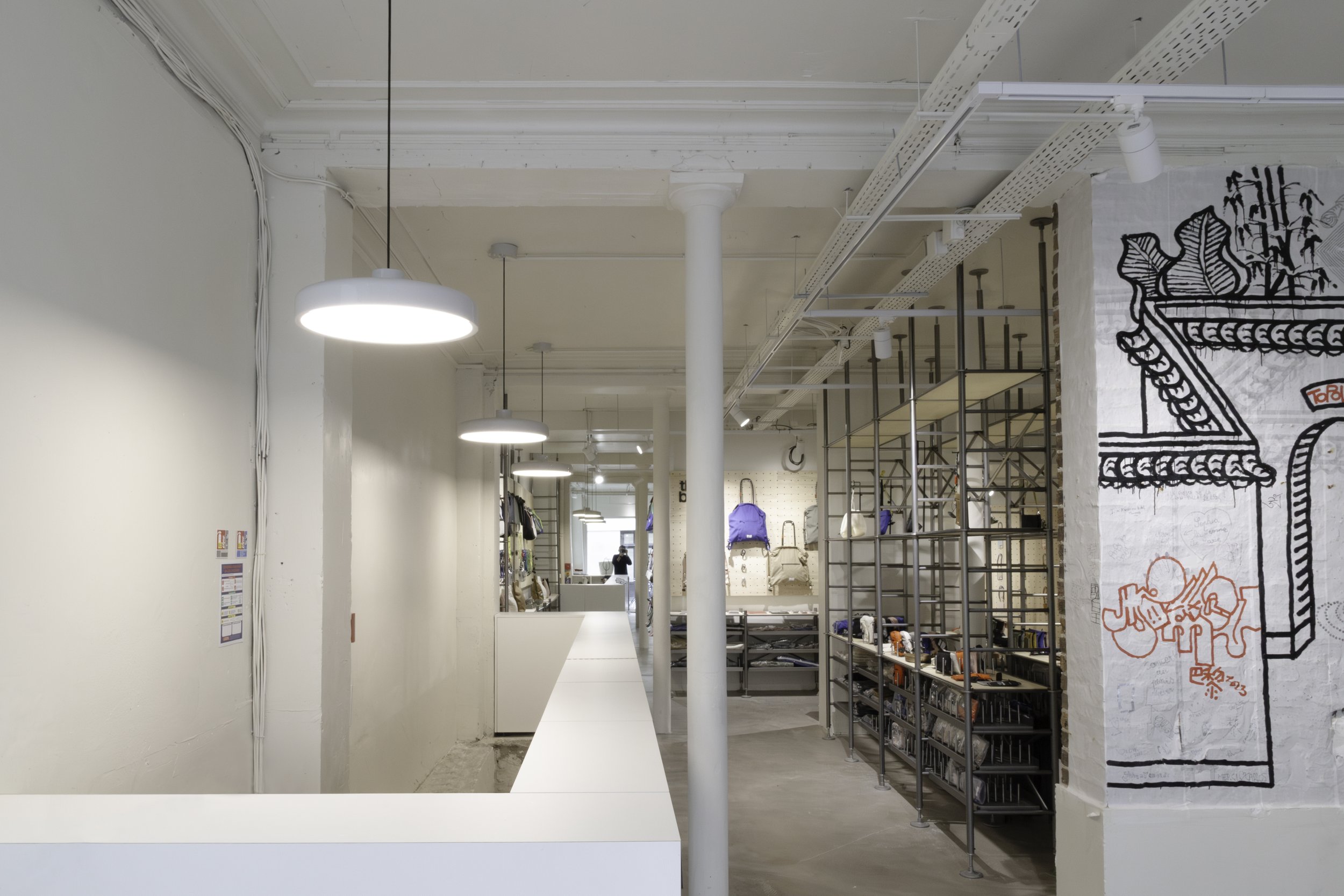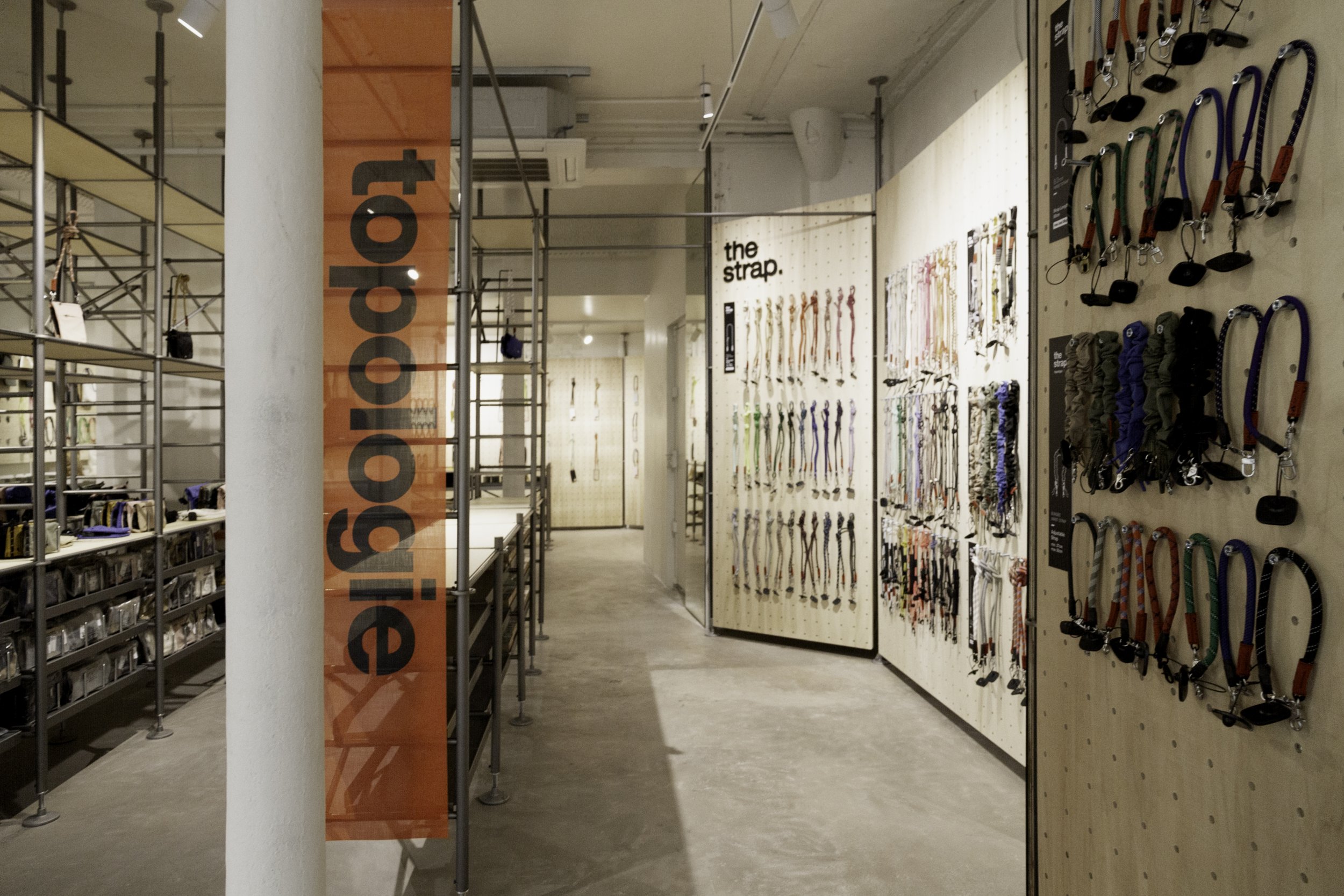 Le magasin a été conçu en collaboration avec le bureau de design japonais Keiji Takeuchi, basé à Milan, qui a traduit le souhait de Topologie, influencée par le matériel d'escalade, d’adopter une esthétique fonctionnelle en se revêtant d’un intérieur et d’un display inspirés des échafaudages.
