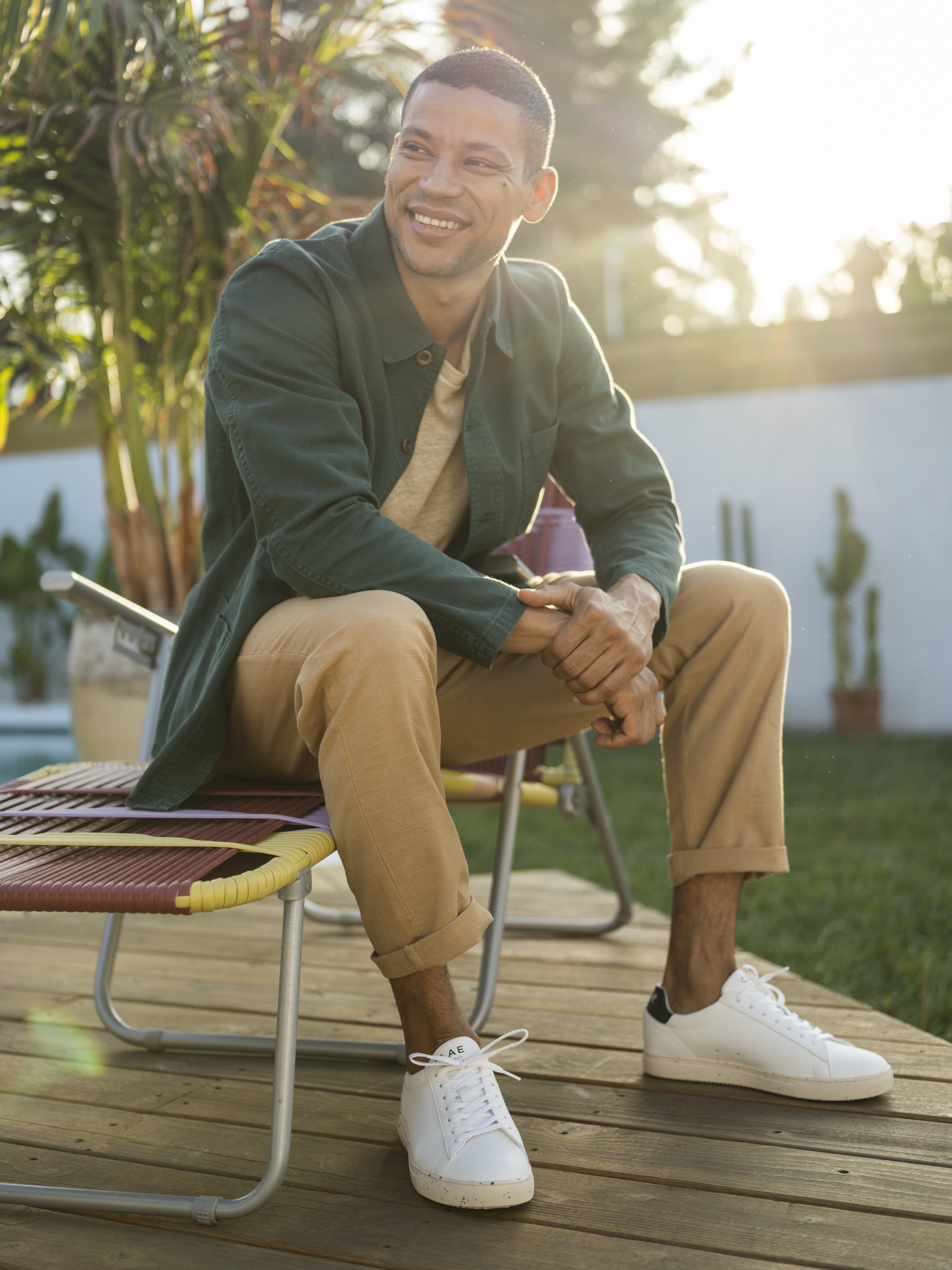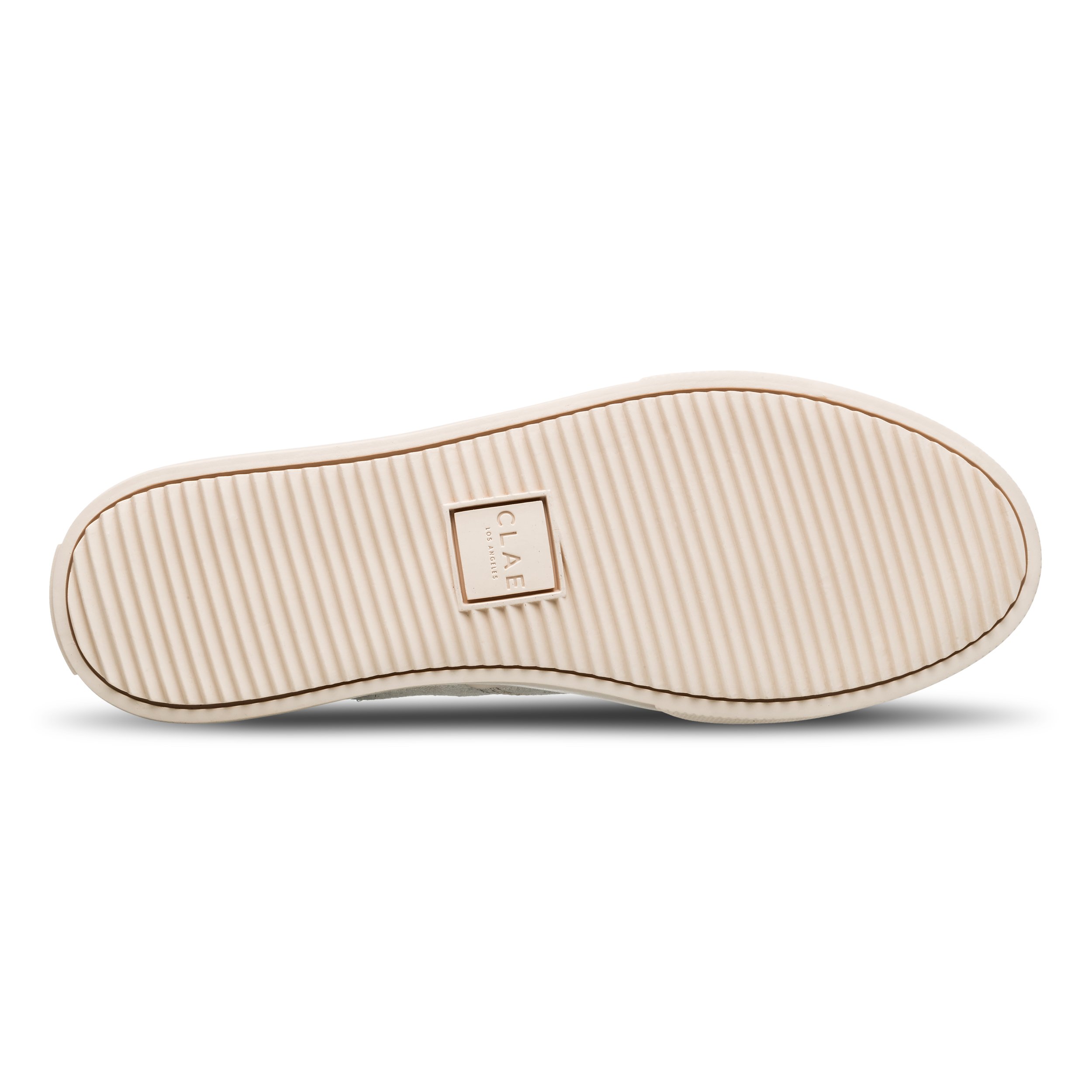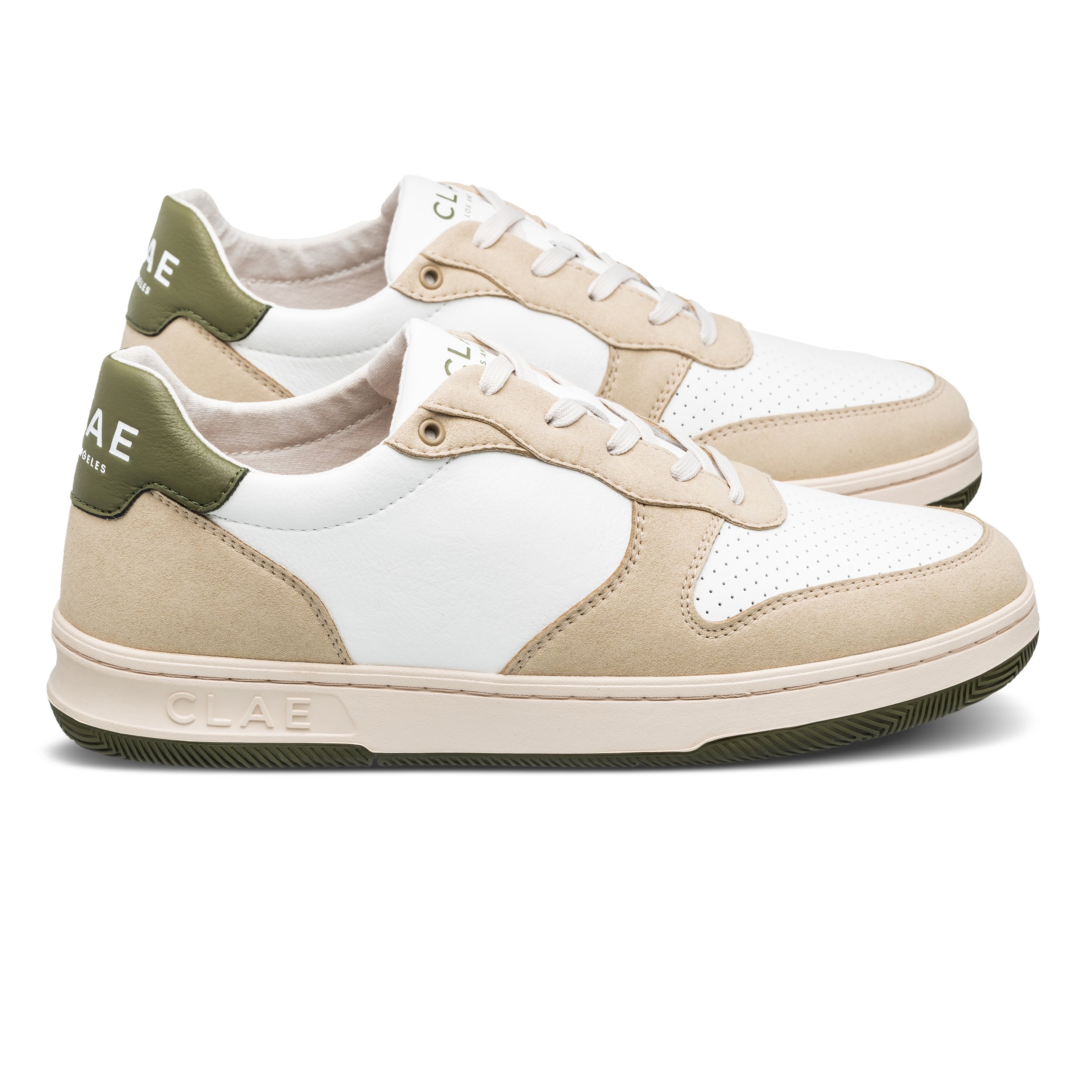 Cette sneaker est disponible dans un nouveau coloris vanille, une teinte neutre et douce qui fait écho au sable chaud de la Californie, l’ADN de la marque Clae. Elle comporte également des touches de couleurs olive, rappelant les paysages verts qui nous entourent. Cette chaussure est fabriqué à partir de matériaux recyclés et de cuirs Nappa italiens.