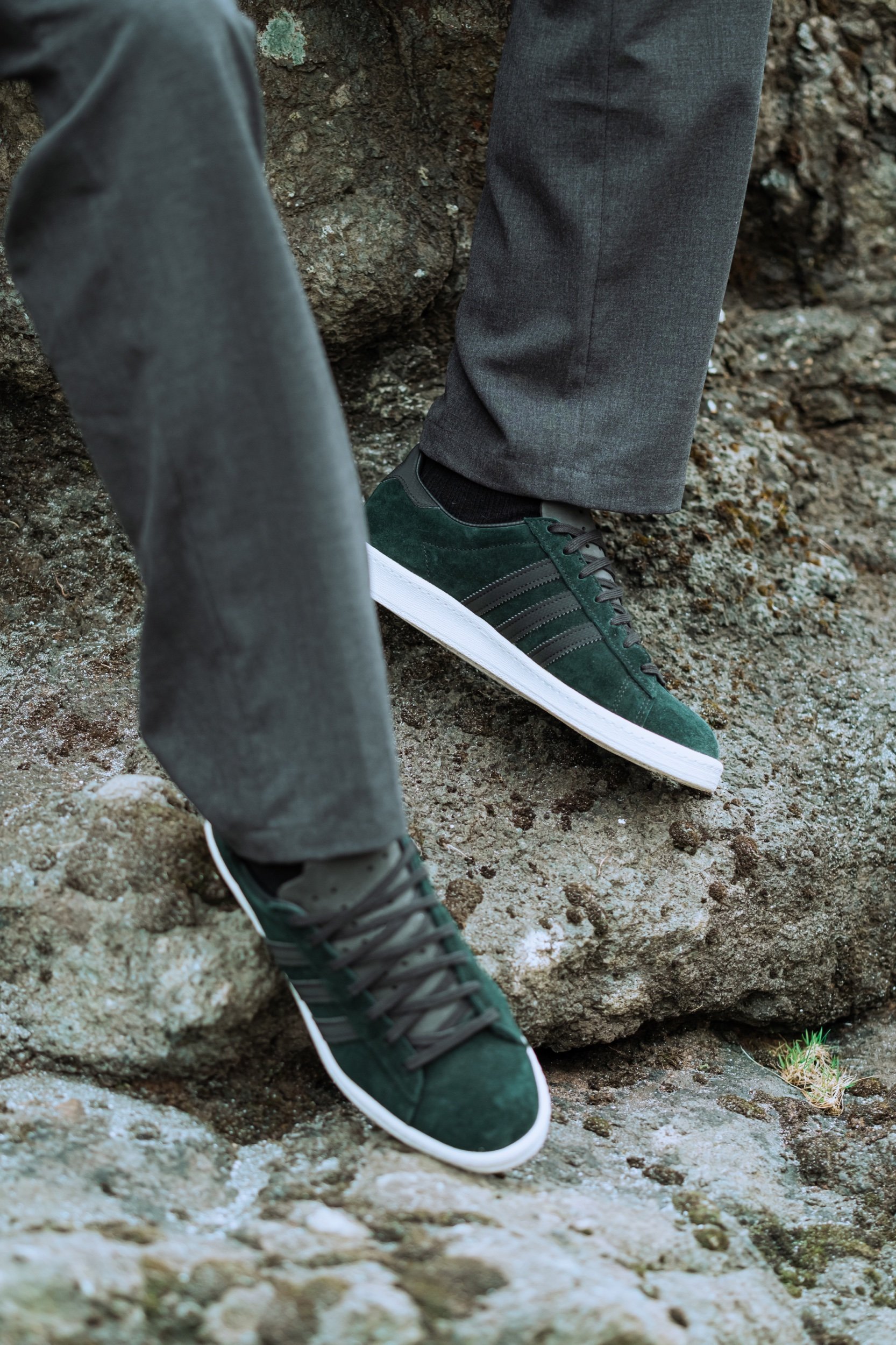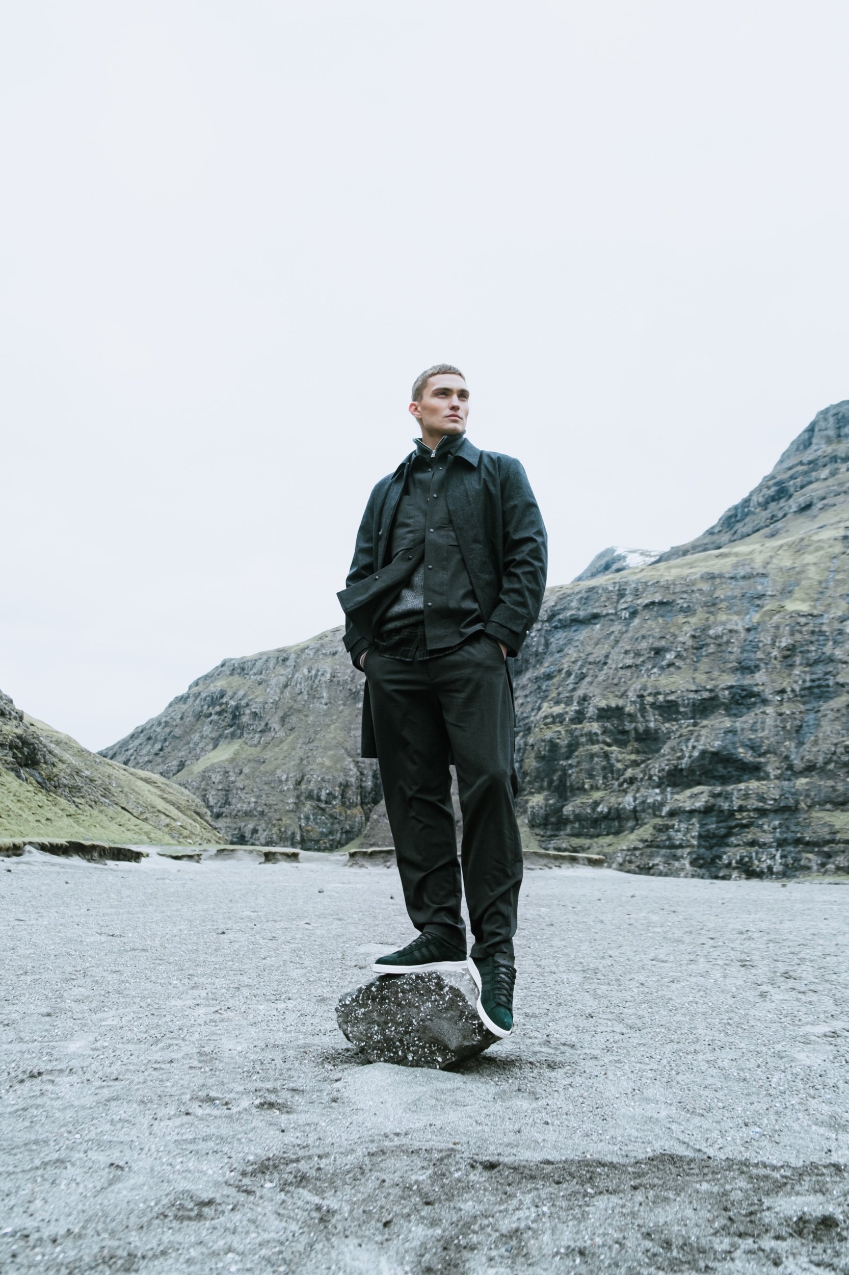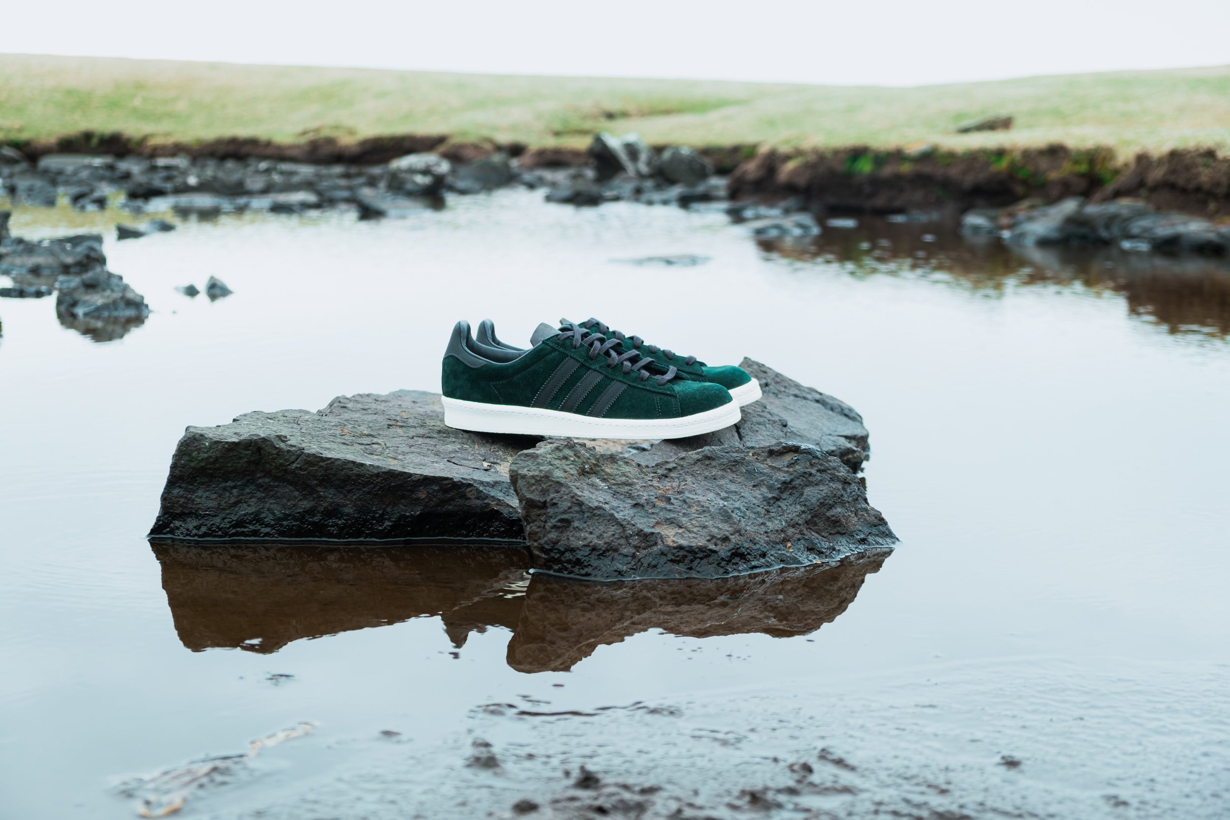 Le modèle Terrex Skychaser est décliné en Ash Black, tandis que la touche Deep Navy caractérise l'obscur spectre de couleurs sombres sur les rochers vitreux qui rejoignent les rives de la mer. La Campus 80s évoque le côté moins rude des îles Féroé. Le vert foncé apparaît sur le Campus comme sur les collines et les habitations de Saksun, un cabinet d'architecture lié aux îles Féroé.