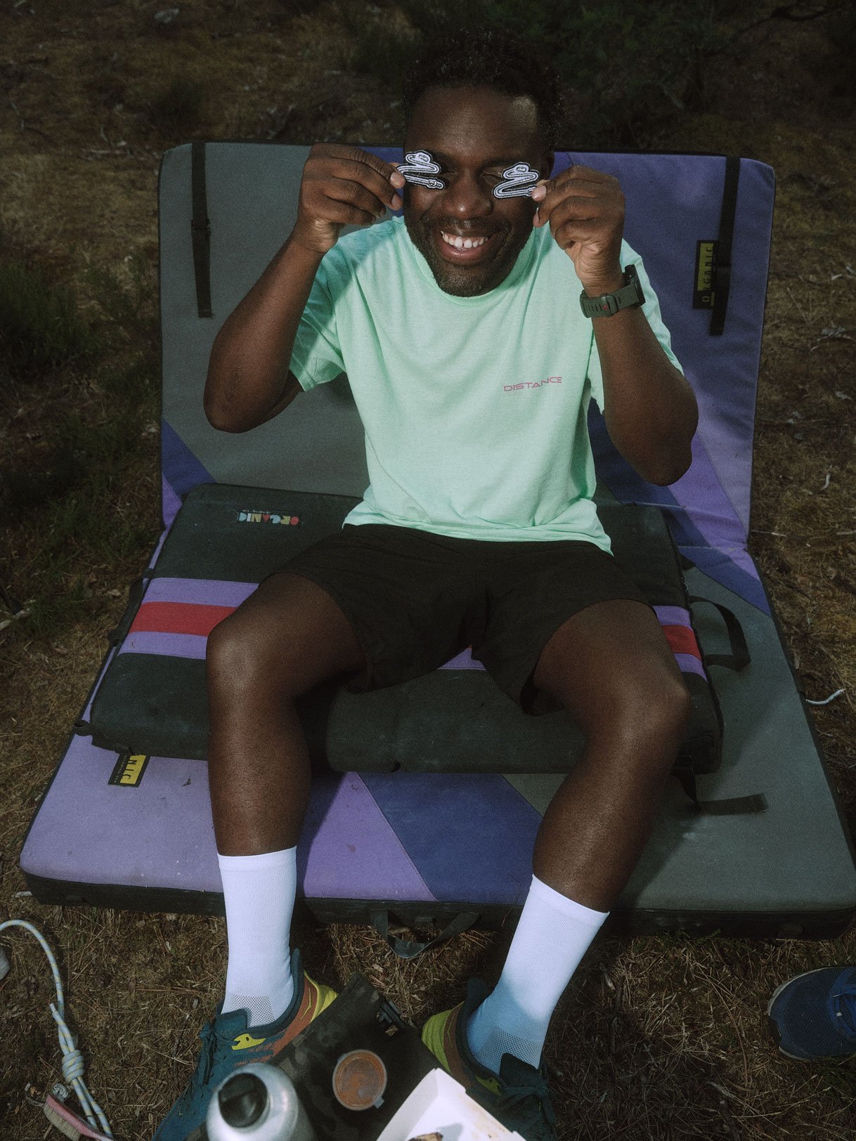 On y trouve une déclinaison de la Bottle Sacoche, du Phone Strap Adapter, du strap 8.0mm, des pins, des patchs ainsi qu’une série d’items vendus exclusivement chez Distance: tee, chaussettes, Palo Santo, gourde Sigg, stickers…