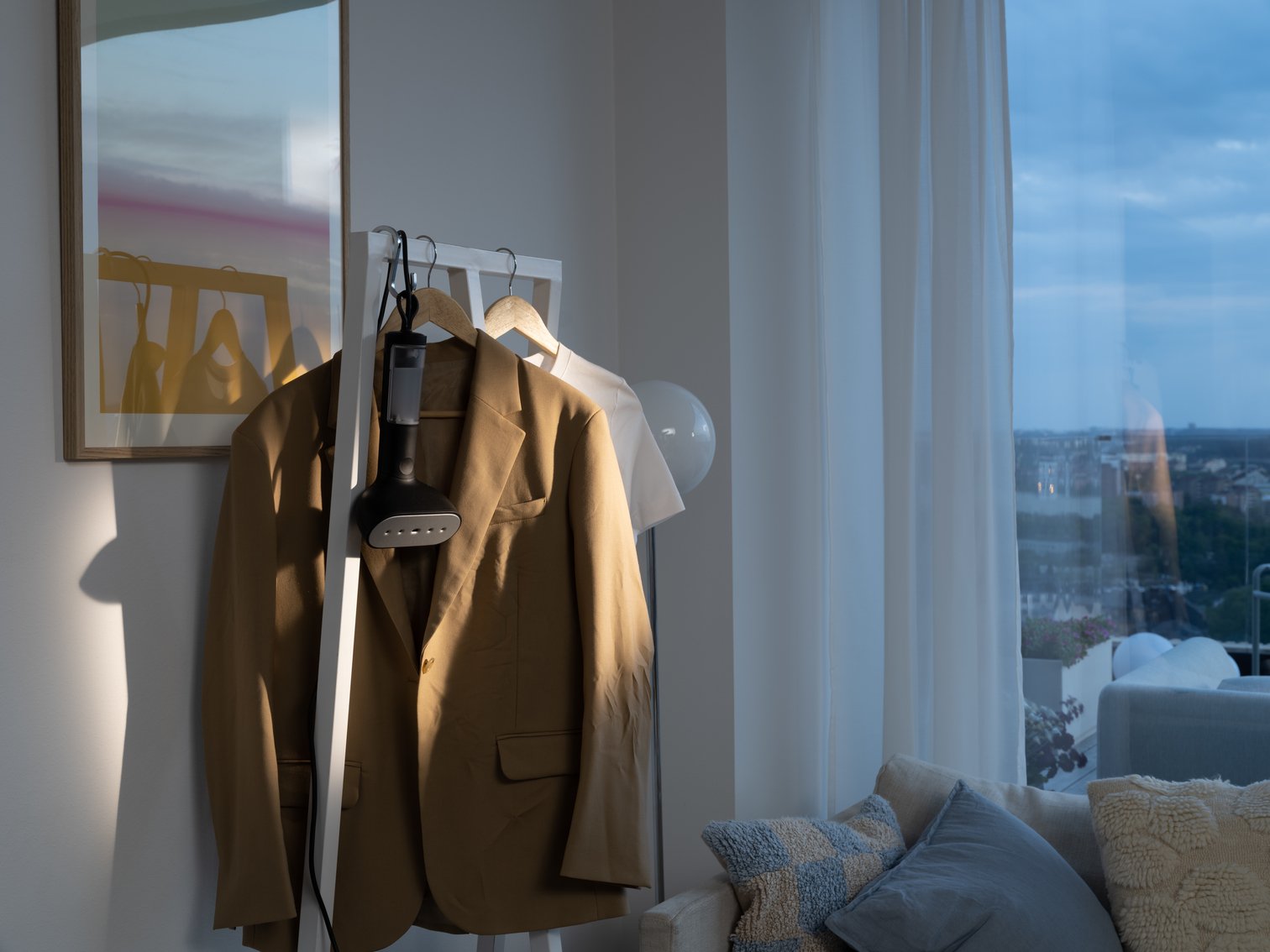 Le défroisseur vapeur portatif Cirrus X peut être accroché à un crochet ou à un cintre à l'aide de la boucle de suspension.