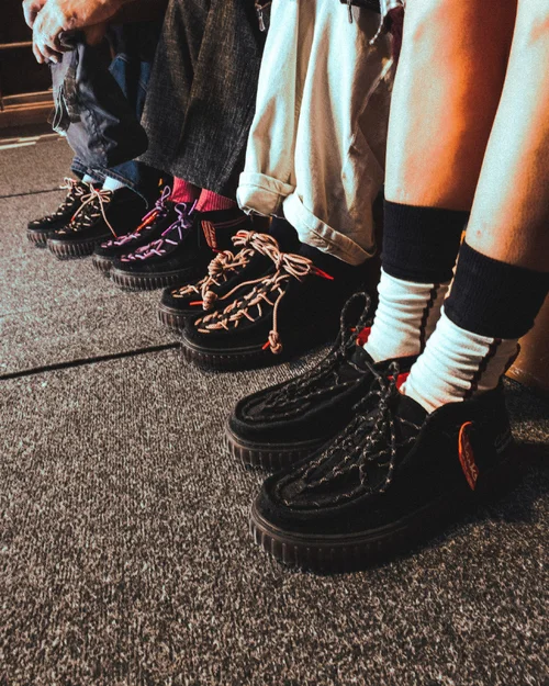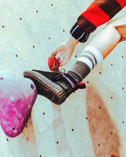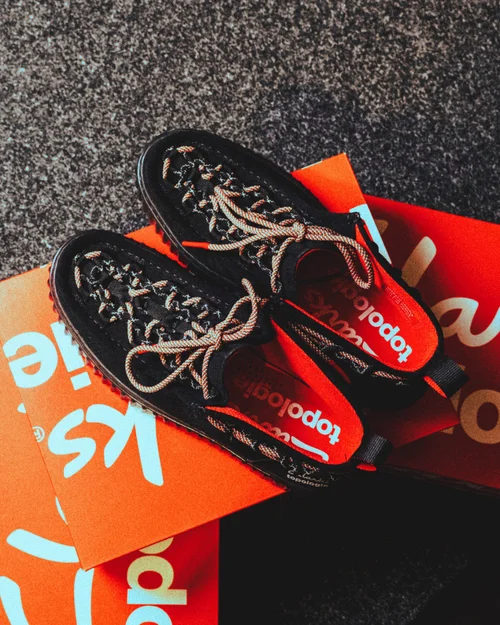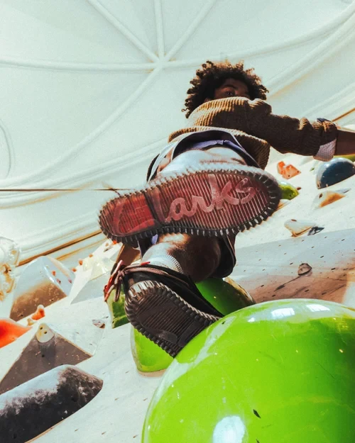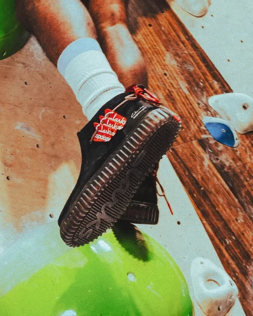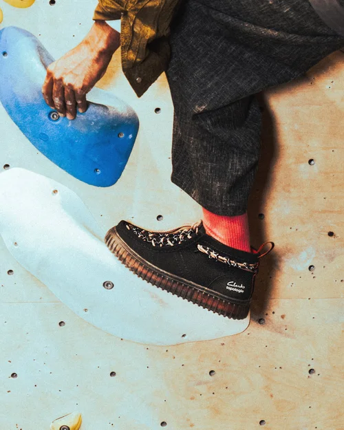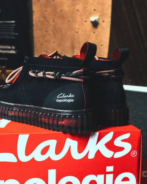 "No Climb Beyond Us", rien n'est impossible à escalader, qu'il s'agisse de roche, de béton ou des défis du quotidien. C'est avec cette philosophie que Topologie et Clarks s'associent pour une collaboration qui réinvente la Torhill Hi, modèle emblématique de la marque de chaussures. Cette rencontre allie le savoir-faire artisanal de Clarks à l'esthétique inspirée de l'escalade propre à Topologie, pour un résultat parfaitement équilibré.