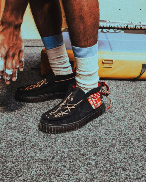 L'Héritage Clarks : La base de la chaussure repose sur le savoir-faire de Clarks, avec une tige en daim noir haut de gamme, une semelle intérieure Contour Cushion qui soutient chaque pas, et la semelle extérieure Torhill emblématique, issue des archives de la marque.