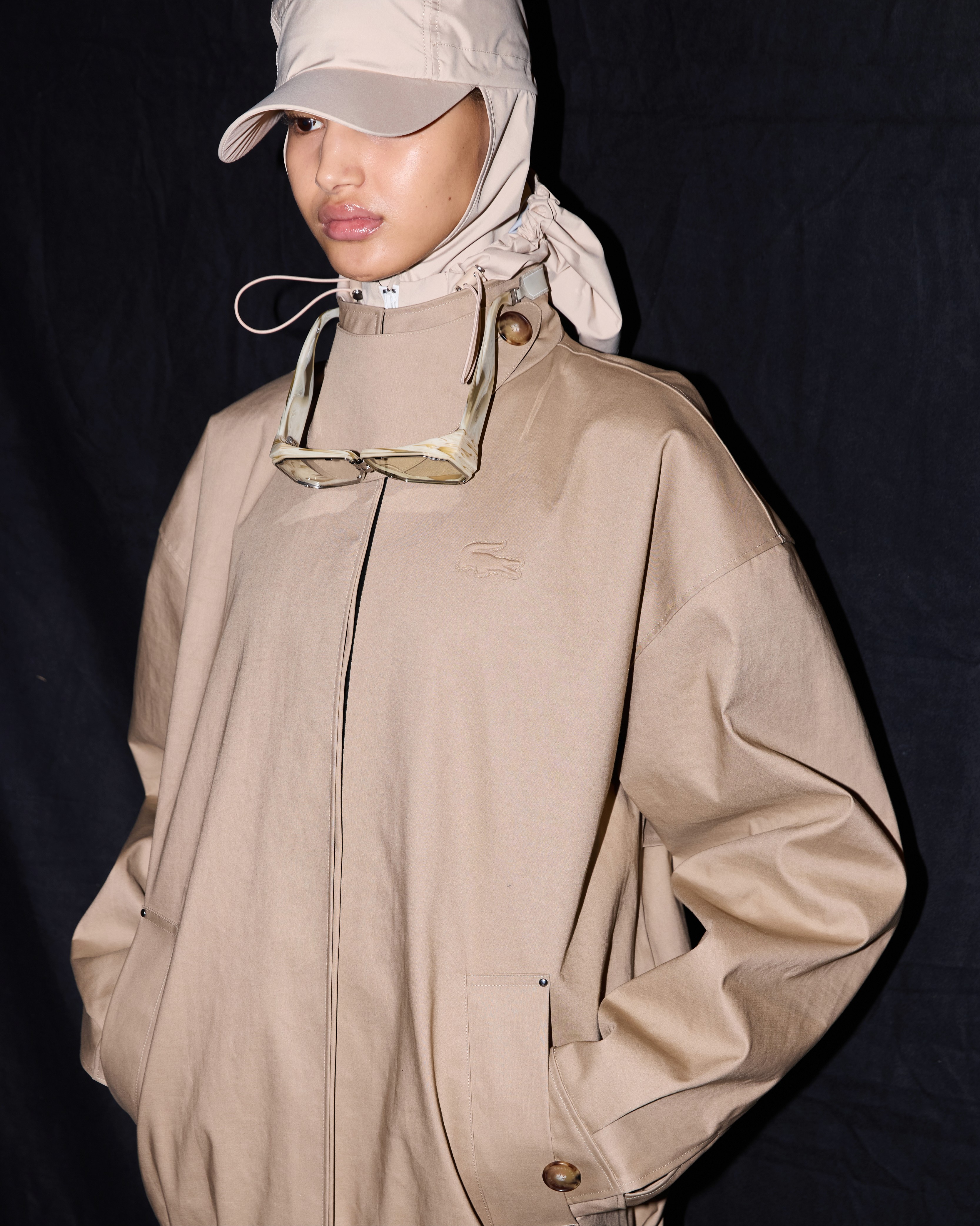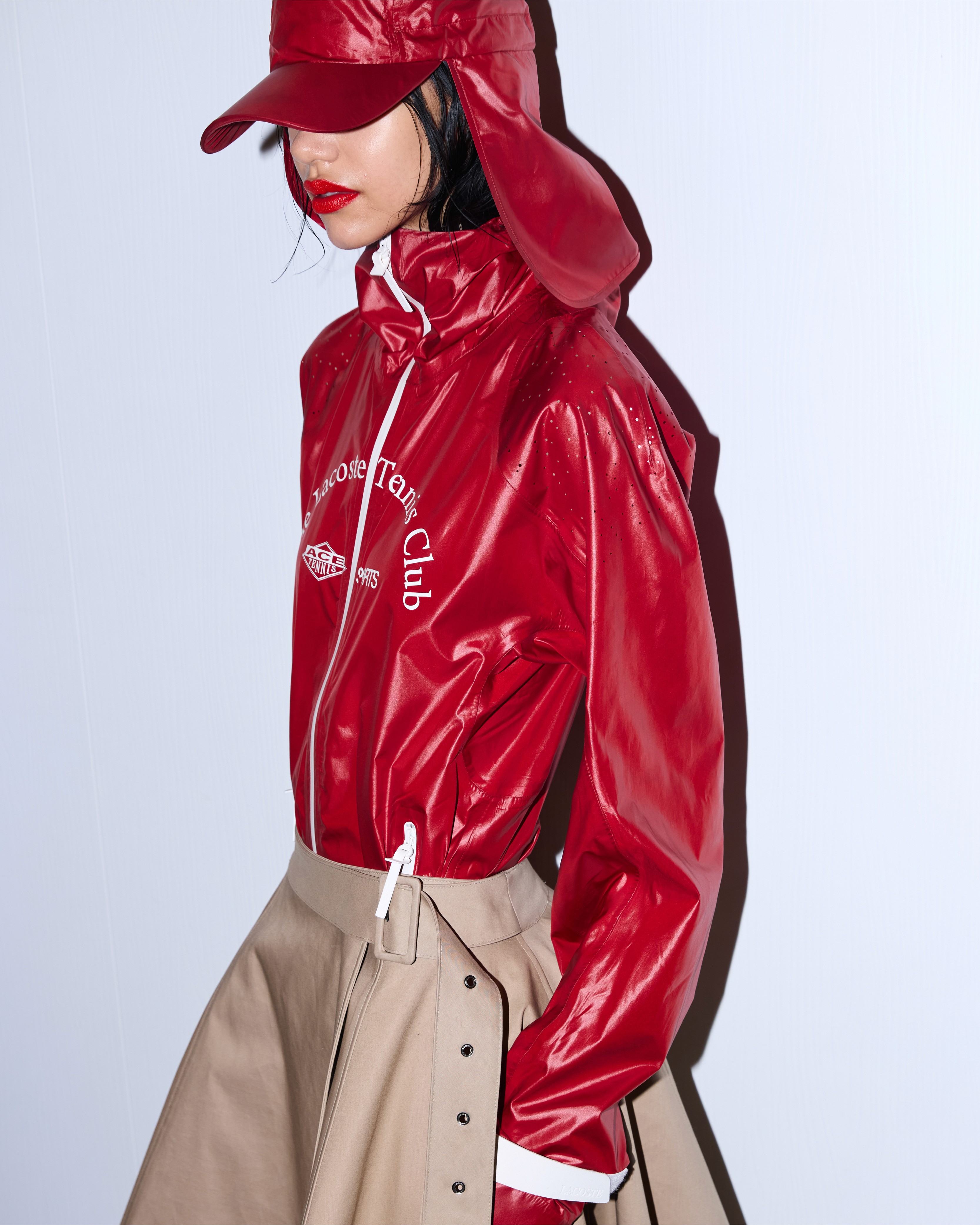 La collab Mackintosh x Lacoste se déploie sur une capsule pointue d'une douzaine de silhouettes qui détourne l'usage traditionnel du coton caoutchouté. Confectionnées à la main en Écosse, où le coton est collé et rubané selon des techniques du XIXe siècle, les pièces surprennent. Si l'on y trouve logiquement des trenchs, la matière iconique de Mackintosh donne également vie à une jupe ample et, plus audacieux encore, à une réinterprétation rigide du célèbre polo Lacoste.